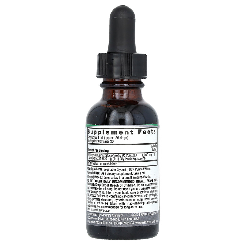 Жидкий экстракт коры йохимбе без спирта от Nature's Answer — это концентрированный травяной экстракт, полученный из коры дерева йохимбе (Pausinystalia yohibe). 1000 мг сушеного растения на порцию (21 мл) предлагают потрясающие преимущества. Не содержащие спирта экстракты Nature's Answer производятся из спирта, очищенной воды USP и натуральных экстрагентов для поддержания их естественного баланса.