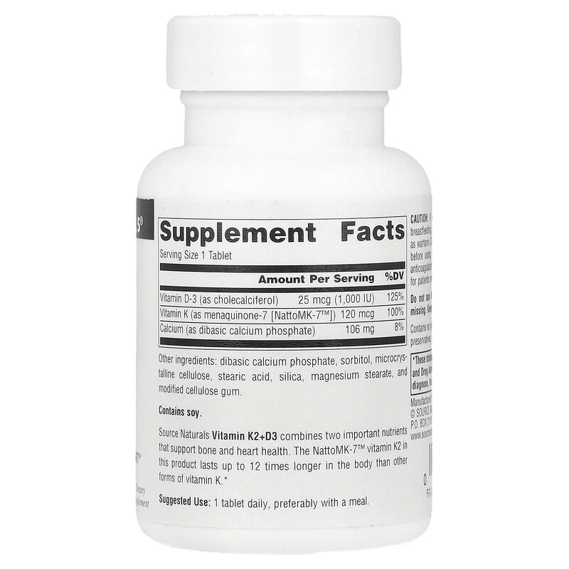 Витамин K2 + D3 от Source Naturals сочетает в себе два важных питательных вещества, поддерживающих здоровье костей и сердца. Витамин K2 NattoMK-7 в этом продукте сохраняется в организме в 12 раз дольше, чем другие формы витамина К.