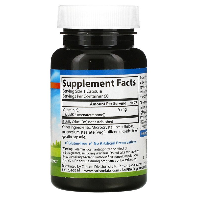 Исследования показывают, что витамин K2 в виде MK-4 (менатетренон) способствует здоровью костей и сердечно-сосудистой системы. Одна капсула содержит 5 мг МК-4.