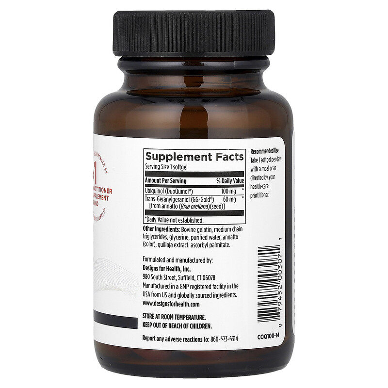 CoQnol 100 содержит уникальное сочетание убихинола и геранилгераниола (ГГ). ГГ дополняет действие убихинола, улучшая усвоение и поддерживая естественный синтез эндогенного коэнзима Q10 в организме. Эта формула содержит 100 мг убихинола в виде DuoQuinol и 60 мг ГГ, экстрагированного из семян аннато, в каждой порции. В его состав входит экстракт килайи и среднецепочечные триглицериды для улучшенного усвоения и биодоступности убихинола и ГГ.