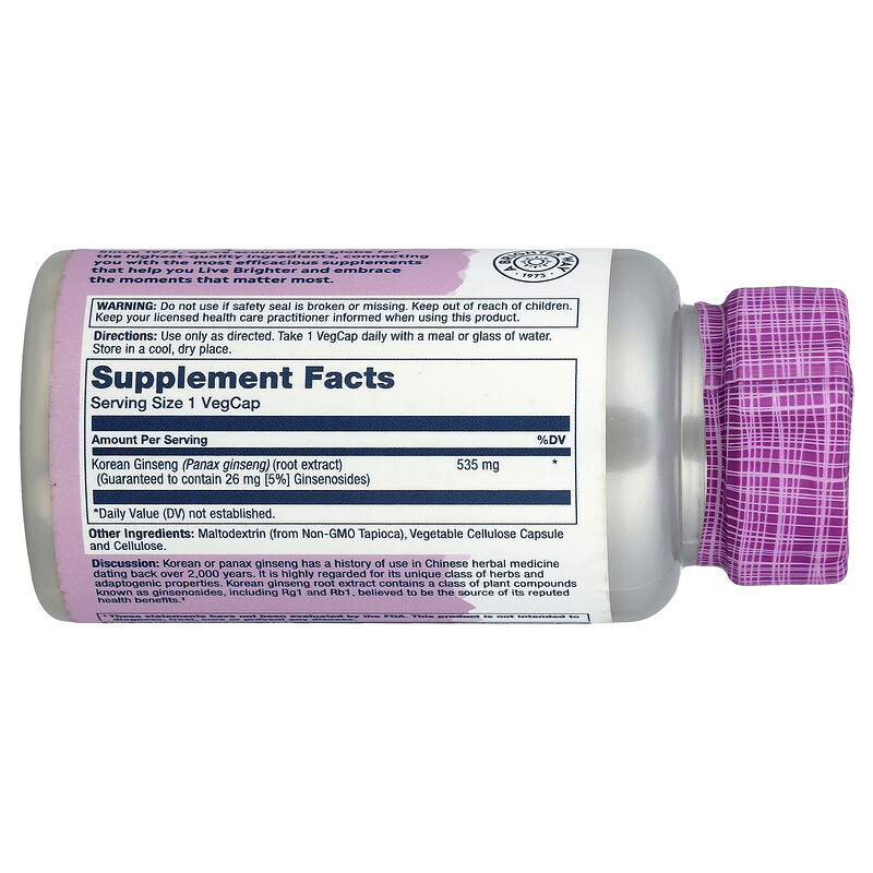 Описание. Корейский женьшень, также известный как женьшень обыкновенный (Panax ginseng), давно используется в фитотерапии. Он высоко ценится благодаря своим адаптогенным свойствам. Адаптогены — это уникальный класс трав, которые поддерживают способность организма адаптироваться к физическим и эмоциональным нагрузкам. Экстракт корня корейского женьшеня содержит класс растительных соединений, известных как гинзенозиды, включая Rg1 и Rb1, которые, как считается, являются источником его полезных для здоровья свойств.