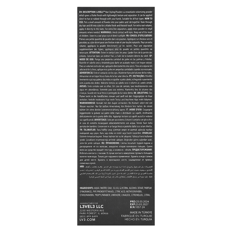 Пудра для укладки волос L3VEL3 - это пудра для увеличения объема, которая придает волосам матовый вид с легкой текстурой и разделением. Его можно наносить прямо на волосы или растирать руками. Подходит для всех типов волос.