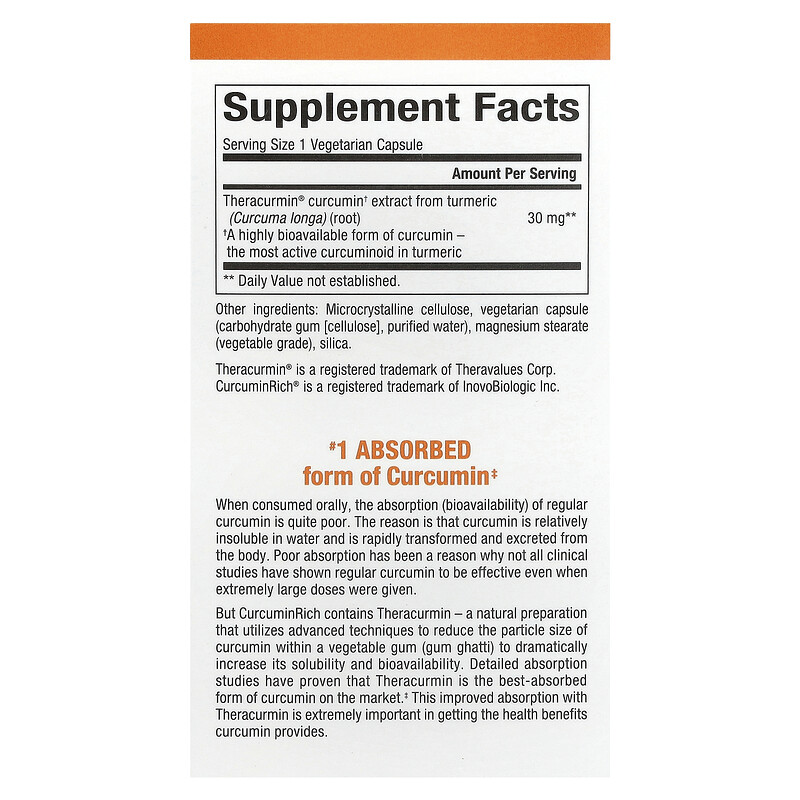 При производстве натурального препарата Theracurmin, который содержится в составе CurcuminRich, используются передовые методы уменьшения размера частиц куркумина в растительной камеди (камедь гхатти), что значительно увеличивает его растворимость и биодоступность. Подробные исследования усвояемости доказали, что Theracurmin является самой лучшей по усвояемости формой куркумина на рынке‡. Улучшенная усвояемость за счет Theracurmin чрезвычайно важна для получения организмом всех полезных свойств куркумина.