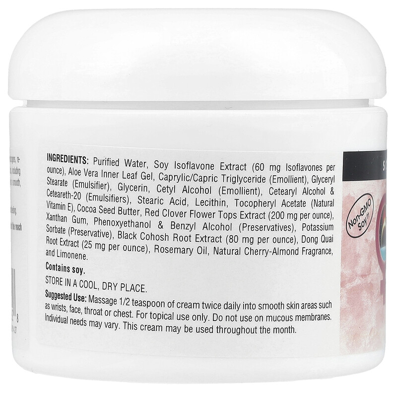 Source Naturals ФИТО-ЭСТРОГЕННЫЙ КРЕМ содержит одни из лучших фитоэстрогенов, которые широко используются во время менопаузы. В состав входят различные растительные экстракты, включая алоэ вера, донг-квай и красный клевер, а также лецитин-эмульгатор для гладкого и насыщенного крема. Каждая унция содержит 60 мг изофлавонов сои, а также 150 мг экстракта сока граната.