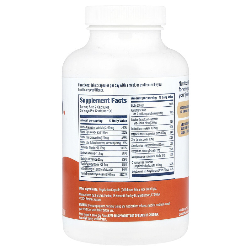 Бариатрические мультивитаминные капсулы Bariatric Fusion - это простой, доступный и удобный способ для пациентов, перенесших бариатрическую операцию, ежедневно получать витамины и минералы для лечения ожирения. Принимая всего 2 капсулы в день, эта формула содержит питательные вещества в биологически доступных формах для поддержки усвоения и использования.