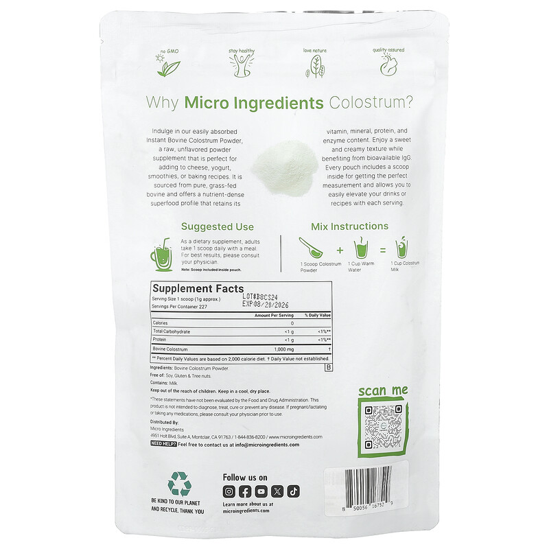 Наслаждайтесь нашим легко усваиваемым порошком из бычьего молозива - необработанной добавкой в виде порошка без вкусовых добавок, которая идеально подходит для добавления в сыр, йогурт, смузи или выпечку. Он получен из чистого крупного рогатого скота травяного откорма и предлагает насыщенный питательными веществами суперпродукт, который сохраняет витамины, минералы, белок и ферменты. Наслаждайтесь сладкой и кремовой текстурой благодаря биодоступным IgG. В каждом пакетике есть мерная ложка для идеального измерения, что позволяет легко подобрать напитки или рецепты с каждой порцией.