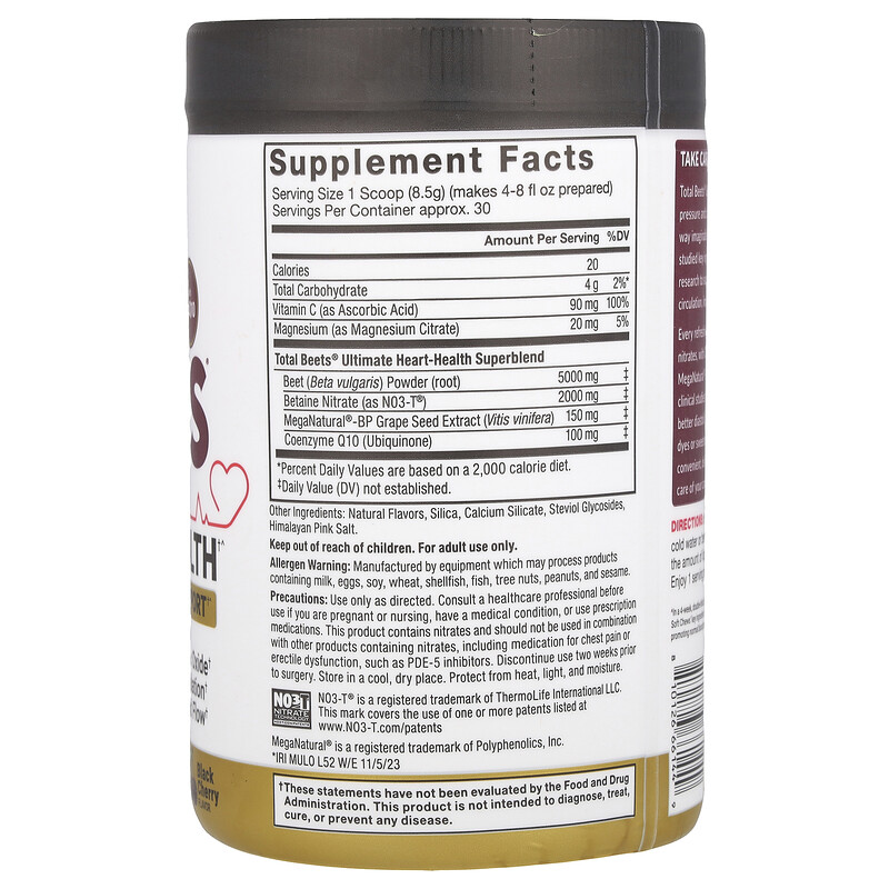 Каждый освежающий глоток содержит мощную смесь нитратов свеклы с коэнзимом Q10, витамином С, магнием и MegaNatural-BP - запатентованным экстрактом виноградных косточек, который, как показали клинические исследования, поддерживает систолическое давление в 5,5 раза и диастолическое артериальное давление в 1,5 раза. ^ С Total Beets Ultimate Heart Health без искусственных красителей и подсластителей - это удобный, вкусный и эффективный способ позаботиться о здоровье сердечно-сосудистой системы.