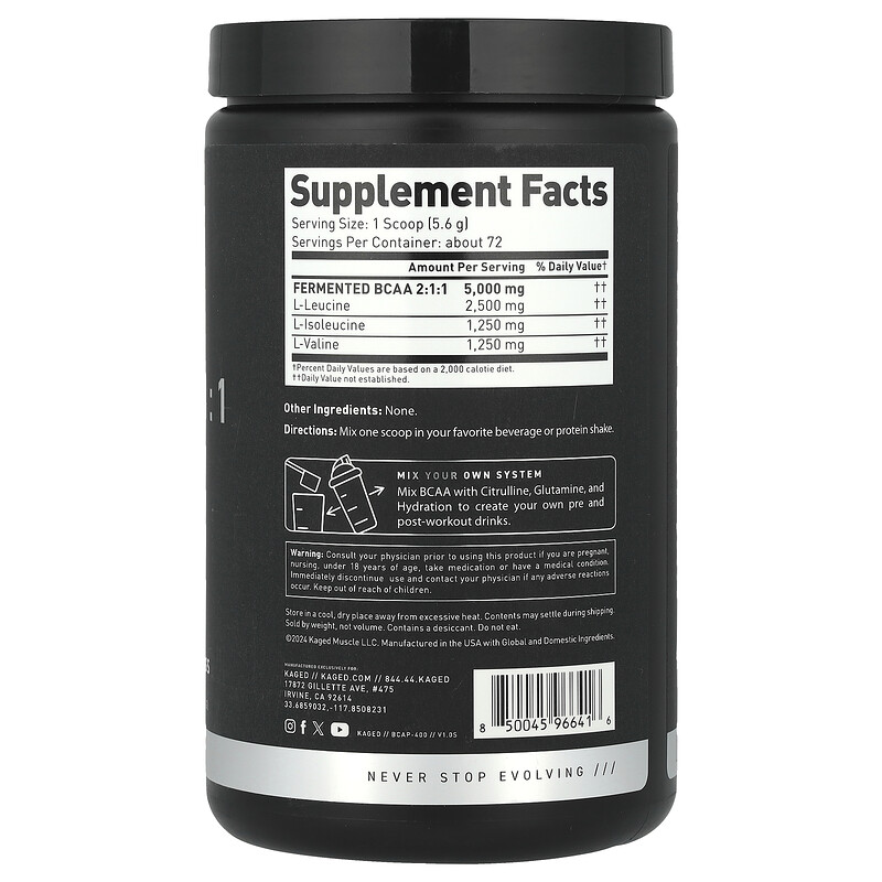 Некоторые из доступных на рынке аминокислот с разветвленной цепью производятся из человеческих волос и птичьих перьев. BCAA от Kaged на 100% веганские, ферментированные и не содержат ГМО. Мы используем научно протестированные BCAA в соотношении 2:1:1. Благодаря быстрому и полному растворению ваши аминокислоты с разветвленной цепью полностью растворятся в воде, не оставляя мутных остатков. Что это значит для вас? Вы получаете BCAA премиального качества, которые поднимут ваши тренировки на новый уровень.