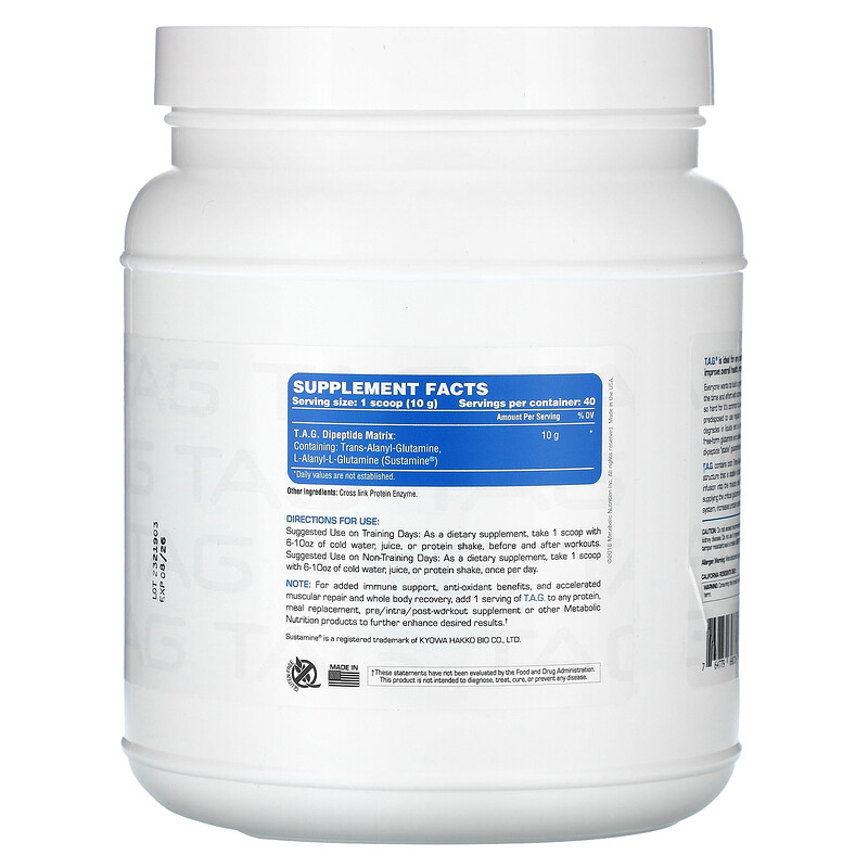 TAG содержит транс-аланил-глутамин и L-аланил-L-глутамин (Sustamine), предлагая единственную дипептидную структуру глутамина, которая стабильна как в жидкости, так и при высоких температурах, но легко всасывается и ассимилируется в кровоток для прямой инфузии. в мышечные клетки. TAG работает, предотвращая потерю мышечного глютамина во время тренировки (то есть потерю мышечной массы), обеспечивая критически важный глютамин, необходимый мышцам во время и после тренировки. Кроме того, ТАГ поддерживает иммунную систему организма, увеличивает синтез белка и выработку гормона роста; что делает его незаменимой добавкой в режиме любого спортсмена.
