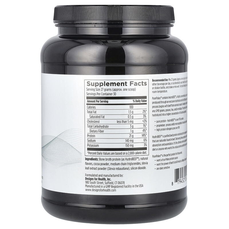 PurePaleo содержит HydroBEEF , высококонцентрированный чистый белок костного бульона, полученный путем эксклюзивного процесса гидролиза и ультрафильтрации. Этот запатентованный процесс начинается с говядины животных, выращенных в Швеции, без гормонов и без ГМО зерен, трав, сена и / или силоса. Этот процесс позволяет гидролизовать белок до более высокой концентрации функциональных пептидов.