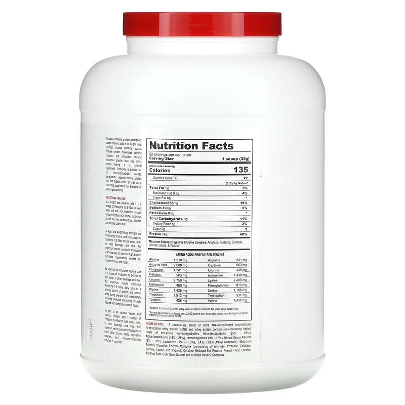 Protizyme увеличивает усвоение белка, восстановление мышц, способствует снижению веса, продлевает физическую выносливость, укрепляет иммунную систему, максимизирует использование питательных веществ и стимулирует выработку мышц в большей степени, чем любой другой белок ... что делает его важной добавкой. Protizyme подходит для всех: для низкоуглеводных, обезжиренных, низкогликемических, низкокалорийных, безглютеновых и диабетических диет ... а также в качестве хорошей пищевой добавки для бариатрических или послеоперационных пациентов.