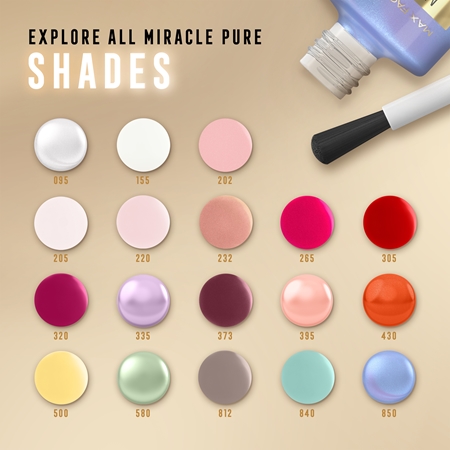 Создайте потрясающий дизайн ногтей с нашей универсальной и экологически чистой коллекцией лаков для ногтей. Лак для ногтей Max Factor Miracle Pure долговечен, а быстросохнущий лак для ногтей на 77% состоит из ингредиентов, полученных из биологических источников, включая минеральную глину, что делает его более экологически чистым./Дышащая формула заботится о здоровом внешнем виде ногтей даже после их удаления, поэтому ногти остаются в отличном состоянии. Благодаря широкому спектру классических скрытых оттенков и ослепительно блестящих лаков, эта коллекция предоставляет безграничные возможности для выражения вашего уникального творчества./Свойства: долговечная и быстросохнущая формула с высоким блеском/выражает ваше исключительное творчество с потрясающими дизайнами ногтей/дышащая формула способствует здоровым ногтям/ассортимент классических оттенков покрытия и блеска/состав: изготовлен из 77% ингредиентов биологического происхождения