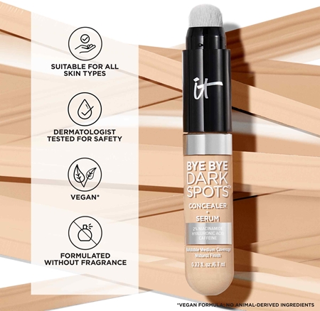 Хотите, чтобы ваш макияж или даже едва накрашенное лицо были свободны от хотя бы одного недостатка красоты? Независимо от того, что вам не нравится на вашей коже, консилер IT Cosmetics Bye Bye Dark Spots надежно прикроет это. Сильно пигментированная формула может справиться с тенями под глазами, прыщами, обесцвечиванием и всевозможными покраснениями и даже веснушками, если вы хотите их скрыть. Короче говоря, это поможет вам скрыть любые недостатки кожи настолько идеально, что только вы будете знать о них. Положитесь на консилер, который придаст вашему лицу безупречный, однородный вид./Свойства: высокое содержание пигмента/длительный эффект/имеет легкую текстуру, которая не подчеркивает морщины/легко наносится/наслоение поможет увеличить интенсивность макияжа/состав: без парфюмерии/как использовать: Нанесите под глаза или на недостатки лица, затем растушуйте и аккуратно погладьте пальцами. Наносите пальцами, кистью или аппликатором.