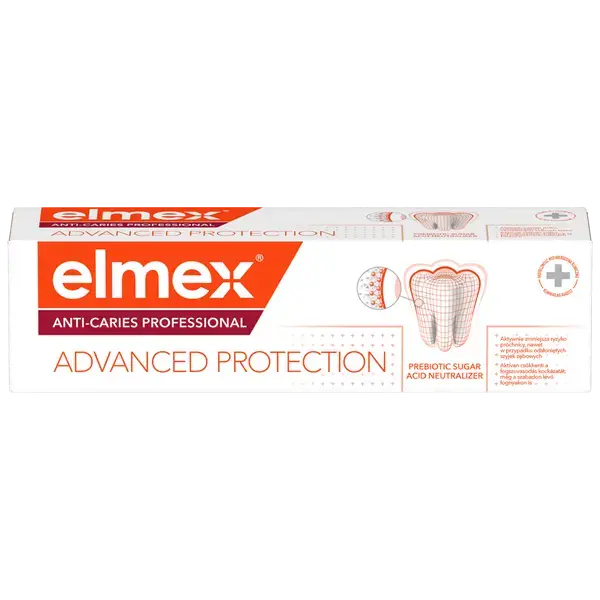 elmex Anti Caries Professional — профессиональная зубная паста с уникальным нейтрализатором сахарной кислоты, который воздействует непосредственно на главную причину кариеса — сахарные кислоты в бактериальном налете. Технология обеспечивает эффективную защиту от кариеса, подтвержденную клиническими исследованиями. Многие продукты питания, не только сладости, содержат сахара, которые могут превращаться в кислоты. Сахар содержится не только в сладостях, закусках и напитках, но и во многих других продуктах питания, таких как фрукты и овощи. Это означает, что он в течение всего дня попадает к нам на зубы и создает опасные сахарные кислоты, которые могут ослабить эмаль и вызвать кариес. Клинически проверенные ингредиенты обеспечивают двойную защиту. Технология нейтрализации сахарной кислоты помогает нейтрализовать сахарные кислоты в бактериальном налете, что предотвращает повреждение эмали, а в сочетании с фторидом и кальцием она более эффективно реминерализует и укрепляет эмаль* и зубы. Основные преимущества использования зубной пасты Elmex Anti-Caries Professional против кариеса: - Борется с основной причиной возникновения кариеса. - Нейтрализует сахарные кислоты, содержащиеся в бактериальном налете. - Реминерализует и укрепляет эмаль. - Рекомендовано стоматологами. Клинические исследования показали, что использование зубной пасты elmex ANTI-CARIES PROFESSIONAL приводит к: - в 4 раза лучшей реминерализации**1, - почти в 2 раза более эффективному обращению вспять развития ранних кариозных поражений**2, - на 20% меньше кариозных поражений после 2 лет использования**3. Продукт разработан швейцарскими специалистами. Проверено клинически. *По сравнению с зубной пастой, содержащей 1450 ppm фторида (монофторфосфата натрия) и аргинина (1,5%). ** по сравнению с обычной фторсодержащей зубной пастой. Ссылки: 1 Канторе и др. 2013. 2 Инь и др. ал. 2013. 3. Ли и др. Дж. Клин Дент. 2015. Производитель: Colgate-Palmolive Services (Польша) Sp. з о. о.; Адрес производителя: ул. Тасмова 7, 02-677 Варшава, Польша; Адрес электронной почты производителя: colgatepalmolive.com ; Владелец регистрационного удостоверения в ЕС: Colgate-Palmolive Europe Sarl; Адрес ответственного лица в ЕС: Colgate-Palmolive Europe Sarl, 4106, Тервиль/Швейцария; Адрес электронной почты ответственного органа ЕС: colgatepalmolive.com