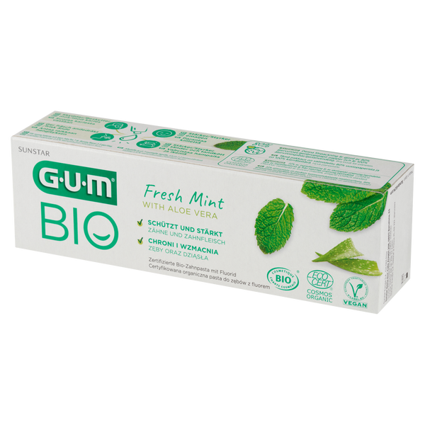 Зубная паста GUM BIO имеет натуральную органическую формулу, состоящую на 99% из натуральных ингредиентов и на 22% из органических ингредиентов. Это естественный способ ухода за зубами, исключительно щадящий для десен и зубов, а добавленный фторид помогает укрепить и защитить эмаль от кариеса. Эта натуральная зубная паста, упакованная в картонную коробку, на 100% пригодную для вторичной переработки, изготовленную из 80% переработанной бумаги, так же эффективна в уходе за деснами и зубами, как и другие зубные пасты GUM.