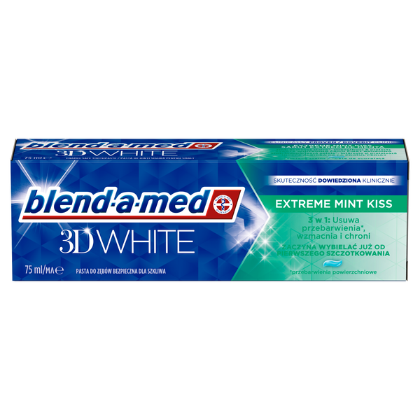 Зубная паста Blend-a-med 3D White Extreme Mint Kiss имеет клинически доказанную эффективность и обеспечивает 3 действия в 1: удаляет поверхностные изменения цвета и отбеливает зубы уже с первой чистки, а также укрепляет и защищает их.