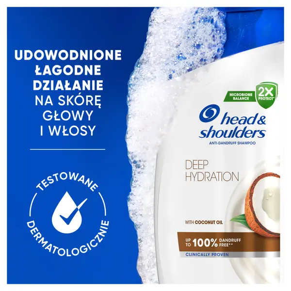 Шампунь против перхоти Head & Shoulders Deep Hydration для всех типов волос и кожи головы борется даже с упрямой перхотью. Формула Microbiome Balance помогает бороться с основной причиной перхоти и поддерживать баланс микробиома кожи головы. Этот шампунь для женщин и мужчин, содержащий кокосовое масло, подходит для ежедневного использования и борется как с видимой, так и с невидимой перхотью. Позволяет в два раза большему количеству защитных ингредиентов проникать в поры, что предотвращает повторное появление даже сильной перхоти. Продукт прошел дерматологические испытания, имеет клинически доказанную эффективность и соответствующий уровень pH, благодаря чему волосы и кожа головы после мытья действительно чистые и свежие.