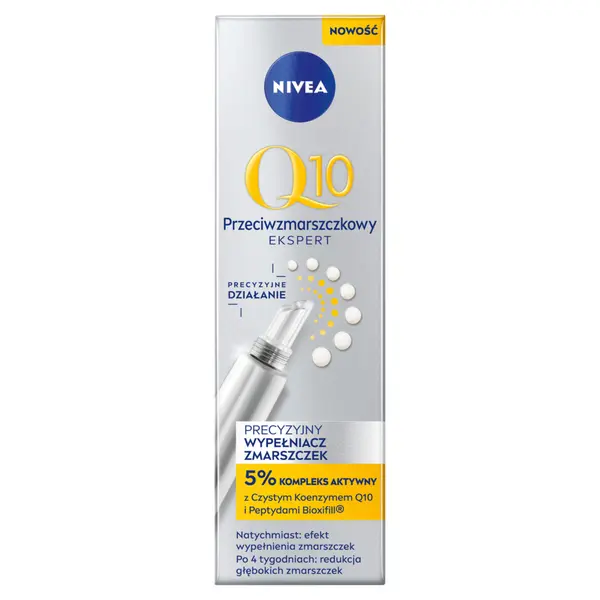 Откройте для себя крем NIVEA Q10, заполняющий морщины! Крем-филлер Precision Wrinkle Filler Cream — это быстро впитывающаяся формула с 5% активным комплексом с чистым коэнзимом Q10 и пептидами Bioxifill. Активные антивозрастные компоненты проникают глубоко через 10 слоев кожи (в верхние слои эпидермиса), стимулируя выработку коллагена. Благодаря этому они заполняют стойкие морщины изнутри (исследование in vitro). Эффект? Видимое уменьшение мелких и глубоких морщин. NIVEA Q10 Wrinkle Filler вокруг рта и глаз — узнайте, почему стоит выбрать его! NIVEA Q10 Wrinkle Filler Serum в виде крема мгновенно придает коже ощущение мягкости и упругости и создает на ее поверхности защитный фильтр. Заполняет и разглаживает морщины на лбу, вокруг глаз и рта, а также в носогубных складках. Заметно сокращает стойкие морщины на 50% (4-недельное исследование с самостоятельной оценкой 41 женщины, 2022 г.). Удобная в использовании, быстро впитывающаяся формула. Переносимость продукта кожей подтверждена дерматологами. Откройте для себя преимущества использования крема от морщин NIVEA: ● содержит чистый коэнзим Q10 и пептиды Bioxifill, ● делает кожу мягкой и упругой, ● мгновенно заполняет морщины, ● заметно уменьшает видимость тонких линий и морщин, ● продукт прошел дерматологические испытания