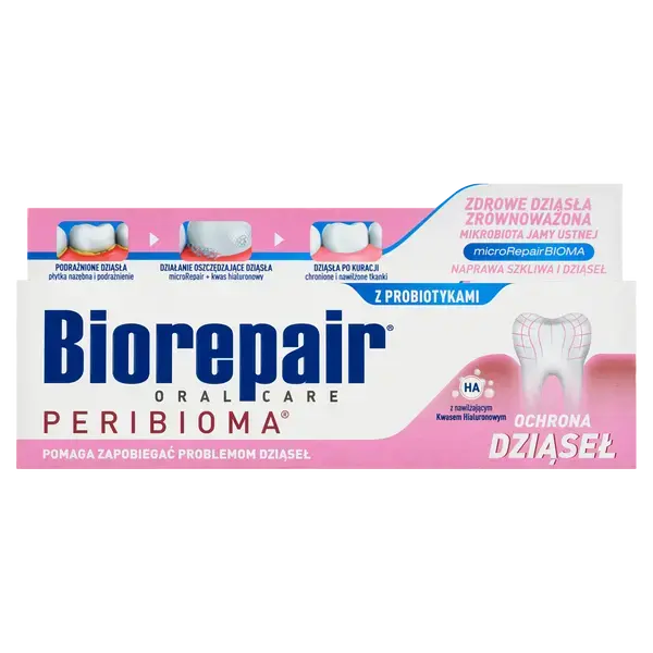 Здоровые десны, сбалансированная микробиота полости рта. Не содержит: - фторида; - диоксида титана; - лаурилсульфата натрия [SLS]; - парабенов; - глютена; - лактозы. Каковы причины чувствительности десен? Основной причиной раздражения десен является зубной налет. Несмотря на хорошую гигиену полости рта, на поверхности зубов и линии десен может скапливаться зубной налет, активируя процесс мукозита. Раздраженные десны начинают кровоточить и болеть. Biorepair Peribioma Gum Protection помогает поддерживать здоровье десен, предотвращая проблемы с деснами. microRepair Bioma Восстанавливает эмаль и защищает ее от образования зубного налета. Формула обогащена пробиотиками, которые помогают поддерживать здоровье десен и сбалансированную микрофлору полости рта. Гиалуроновая кислота Укрепляет десны благодаря своим увлажняющим и защитным свойствам. Натуральные экстракты гамамелиса, календулы и спирулины Обладают вяжущими и успокаивающими свойствами. Biorepair peribioma — это новая система, состоящая из зубной пасты и пены для полоскания рта, созданная в результате передовых исследований в области гигиены полости рта: баланса микробиоты. Разработанный для борьбы с раздражением десен, неприятным запахом изо рта и кровотечением, он помогает предотвратить раздражение вокруг имплантата. Что такое микробиота полости рта? Микробиота полости рта представляет собой совокупность микроорганизмов, которые живут в симбиозе во рту. В этой экосистеме обычно устанавливается баланс между многочисленными видами бактерий и защитными системами организма. Однако изменение этого баланса может вызвать патологии в полости рта, в частности проблемы с пародонтом. Biorepair Peribioma Защита десен Все продукты линейки Biorepair Peribioma — единственные, которые содержат microRepairBioma — активное средство для восстановления эмали, обогащенное определенными штаммами пробиотиков с инновационным действием, которые поддерживают баланс здоровой микрофлоры полости рта. Правильный баланс микрофлоры полости рта помогает предотвратить образование зубного налета и основные причины кровоточивости, неприятного запаха изо рта и раздражения десен. Формула зубной пасты Biorepair Peribioma Gum Protection идеально подходит для ежедневной защиты эмали и нежных десен от образования зубного налета. Его формула обогащена пробиотиками и натуральными экстрактами гамамелиса, календулы и спирулины, которые обладают вяжущими и успокаивающими свойствами.