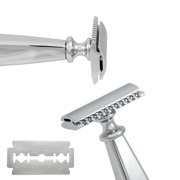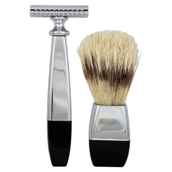 Эксклюзивный набор из четырех предметов для классического бритья. В комплект входит бритва, помазок, подставка и миска. Отдельные элементы изготовлены из хромированной нержавеющей стали высочайшего качества. Ручка бритвы и ручка помазка изготовлены из черного синтетического материала. Это решение очень гигиенично и практично для частого бритья. Бритва имеет безопасный закрытый гребень, адаптированный под классическое бритвенное лезвие. Предназначен для бритья короткой повседневной бороды. Идеально подходит для мужчин, начинающих осваивать классическое бритье. Щетка покрыта натуральной щетиной кабана. Специальные крючки на концах щетинок эффективно приподнимают волосы, облегчая процесс их стрижки бритвой. Щетинки обладают антистатическими свойствами. Она довольно жесткая, что позволяет отшелушивать омертвевшие клетки кожи во время нанесения пены. Щетка идеально подходит для мужчин, которые любят интенсивный массаж кожи лица. Набор упакован в черную коробку с логотипом бренда. Идеально подходит как в качестве подарка, так и для повседневного использования.