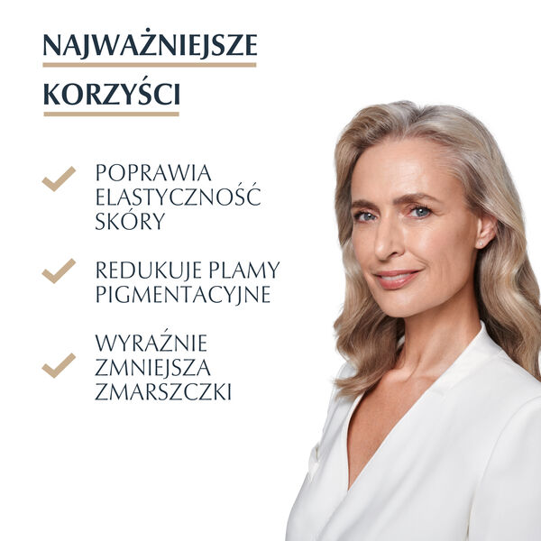 Уменьшает пигментные пятна Заполняет морщины Улучшает эластичность кожи Инновация: запатентованный Тиамидол Тройное антивозрастное действие: 1. Заполняет морщины: формула с высоко- и низкомолекулярной гиалуроновой кислотой увлажняет и разглаживает даже глубокие морщины. 2. Повышает эластичность кожи: инновационный активный ингредиент Arctiin ускоряет процесс обновления коллагена в клетках кожи.* 3. Уменьшает пигментные пятна: формула с тиамидолом, эффективность которого доказана клинически, уменьшает видимость пигментных пятен. Первые результаты уже через 2 недели. Клинические и дерматологические испытания подтверждают хорошую переносимость кожей и эффективность. *in vitro дерматологический уход за кожей