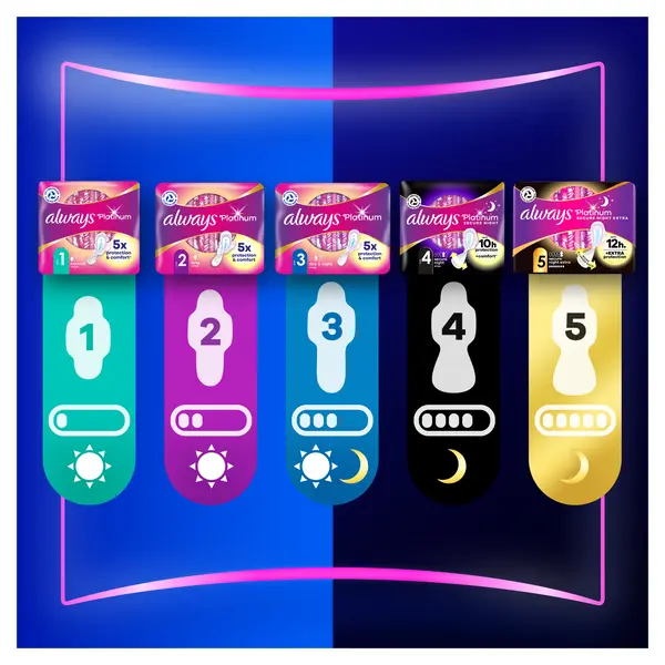 Прокладки Always Platinum с крылышками ComfortLock разработаны для лучшей посадки*, поэтому они не протекают, не смещаются и не вызывают дискомфорта. С прокладками Always Platinum вам не придется беспокоиться о менструации. Always Platinum Normal (размер 1) с крылышками рекомендуется использовать в дневное время при слабых и умеренных выделениях. Попробуйте Always Platinum Secure Night Extra (размер 5) — лучшие ночные защитные прокладки Always Platinum. *по сравнению с предыдущим продуктом
