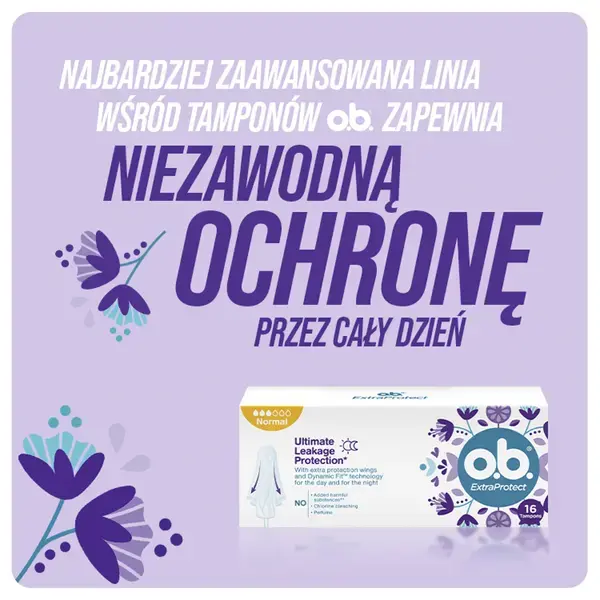 ob Extra Protect сочетает в себе две передовые технологии, обеспечивая вам до 100% защиты от протеканий* как днем, так и ночью - защитные крылышки ExtraProtection улавливают жидкость, которая могла бы проникнуть через обычные тампоны - благодаря технологии Dynamic Fit ob адаптируется к вашему телу, а переплетенные канавки эффективно направляют жидкость в тампон. В состав продукции не входят вредные вещества**, хлор, отдушки *** в соответствии со стандартом Oeko-Tex Standard 100 Внутренняя часть тампона на 100% растительного происхождения Прошел гинекологические испытания