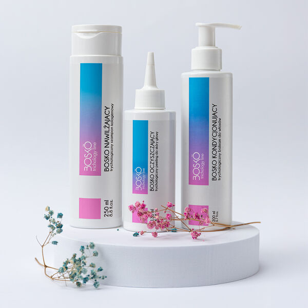 НАБОР ДЛЯ ТРИХОЛОГИИ - ПИЛИНГ, ШАМПУНЬ, БАЛЬЗАМ. Очищающий трихологический пилинг для кожи головы: трихологический пилинг, который очищает и разглаживает кожу головы, приподнимает волосы у корней и дарит ощущение свежести и чистоты. Эффективно удаляет омертвевшие клетки кожи. При регулярном использовании регулирует выработку кожного сала и помогает бороться с перхотью. Улучшает состояние кожи головы и дарит ощущение увлажненности. Легко наносится и смывается. Рецепт разработан совместно с трихологом. Как это работает? Разглаживает и очищает кожу головы. Удаляет омертвевшие клетки кожи. Приподнимает волосы у корней и дарит ощущение свежести и чистоты. Улучшает состояние кожи головы. Стимулирует микроциркуляцию. Удаляет кристаллизационный слой кожи головы (грязь, пыль, сигаретный дым, остатки повседневных средств для укладки волос и чрезмерное скопление омертвевших клеток кожи). При регулярном использовании регулирует выработку кожного сала. Уменьшает эффект жирности кожи. Уменьшает зуд кожи головы и помогает бороться с перхотью. Легко наносится и смывается. Кондиционирующий трихологический бальзам для волос BOSKO: Глубоко питает, увлажняет, дисциплинирует волосы и укрепляет их структуру. Защищает от повреждений, придает им мягкость и блеск. Благодаря содержанию хелатирующего вещества бальзам удаляет минеральные отложения, которые образуются, например, при контакте волос с хлорированной или жесткой водой. В результате волосы становятся более мягкими и эластичными. Формула косметического средства создана на основе новейших достижений биотехнологии. Рекомендуется для волос: Поврежденных Окрашенных Тусклых Вьющихся Сухих Электризующихся Пористых Спутывающихся после мытья шампунем Подвергающихся частому контакту с высокими температурами, солнцем или хлором Эффект: При регулярном использовании кондиционера волосы становятся увлажненными, гладкими, полными блеска и объема. Активные кондиционирующие компоненты нейтрализуют заряды на волосах, благодаря чему они перестают электризоваться. Средство защищает волосы от высоких температур. УНИКАЛЬНАЯ ФОРМУЛА РАЗРАБОТАНА В СОТРУДНИЧЕСТВЕ С ТРИХОЛОГОМ НА ОСНОВЕ ВЫСОЧАЙШЕГО КАЧЕСТВА ИНГРЕДИЕНТОВ И ИХ ЭФФЕКТИВНОСТИ. Увлажняющий трихологический коллагеновый шампунь BOSKO: Увлажняющий шампунь BOSKO с гидролизованным морским коллагеном, благодаря сочетанию уникальных формул и ингредиентов, тщательно очищает кожу головы от загрязнений, оказывает успокаивающее и увлажняющее действие. Поддерживает процесс регенерации эпидермиса и оказывает регулирующее действие на микробиом кожи. СВОЙСТВА: Очищает кожу головы от загрязнений. Поддерживает волосы в здоровом состоянии. Успокаивает, питает и увлажняет кожу головы. Регулирует выработку кожного сала. Дарит ощущение питания коже головы и волосам. Продукт приятен на ощупь и легко смывается. Шампунь для ежедневного использования и всех типов кожи головы и волос.
