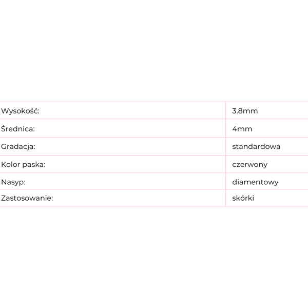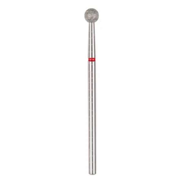 Шарообразная алмазная фреза с красной полосой на ручке. Диаметр режущей головки составляет 4 мм, что позволяет производить точное и бережное удаление кутикулы без риска повреждения ногтевой пластины. Длина рабочей части составляет 3,8 мм, что позволяет производить точную работу на небольших участках.