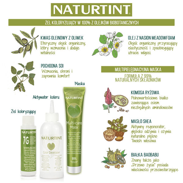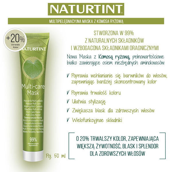 Инновационная и деликатная формула Naturtint ценится потребителями по всему миру, которые ищут мягкость и блеск, более интенсивное увлажнение и естественный цвет: * Быстрая и простая в использовании не стекающая гелевая формула, * Повышенное увлажнение, * Более крепкие, гладкие и напитанные волосы, * Интенсивный и стойкий цвет, * Оптимальный уход за кожей головы, * Протестировано дерматологами, * Подходит для веганов, * 100% закрашивает седые волосы, Содержит многофункциональную маску, состоящую на 99% из натуральных ингредиентов и обогащенную органическими ингредиентами, Объем 50 мл позволяет повторять применение в течение следующих недель. Основным ингредиентом маски является киноа — полноценный белок, содержащий восемь незаменимых аминокислот.