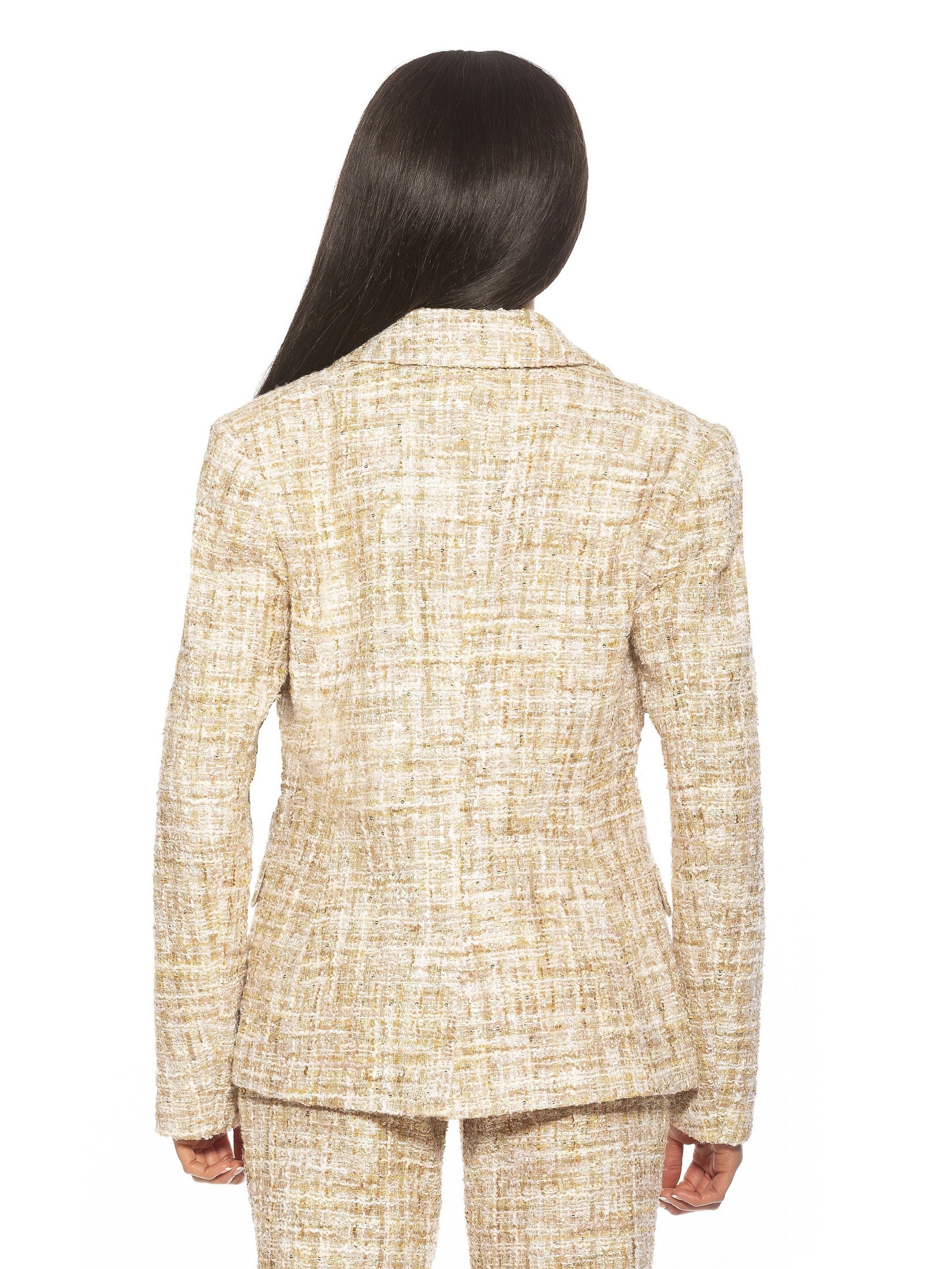 Этот классический блейзер имеет приталенный крой с заостренными лацканами, длинными рукавами и золотыми пуговицами. Роскошная твидовая ткань облагораживает образ, а двубортная застежка на пуговицы обеспечивает надежную и привлекательную посадку. Идеальная вещь для делового шикарного наряда.