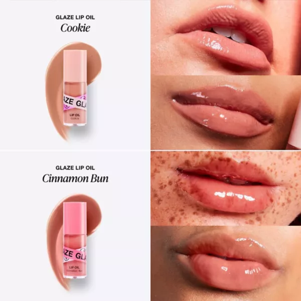 - 2 x 0,2 унции/6 мл масла для губ Glaze Lip Oils в оттенках Cinnamon Bun (нюдовый лиловый), Cookie (классический бежевый нюд)
