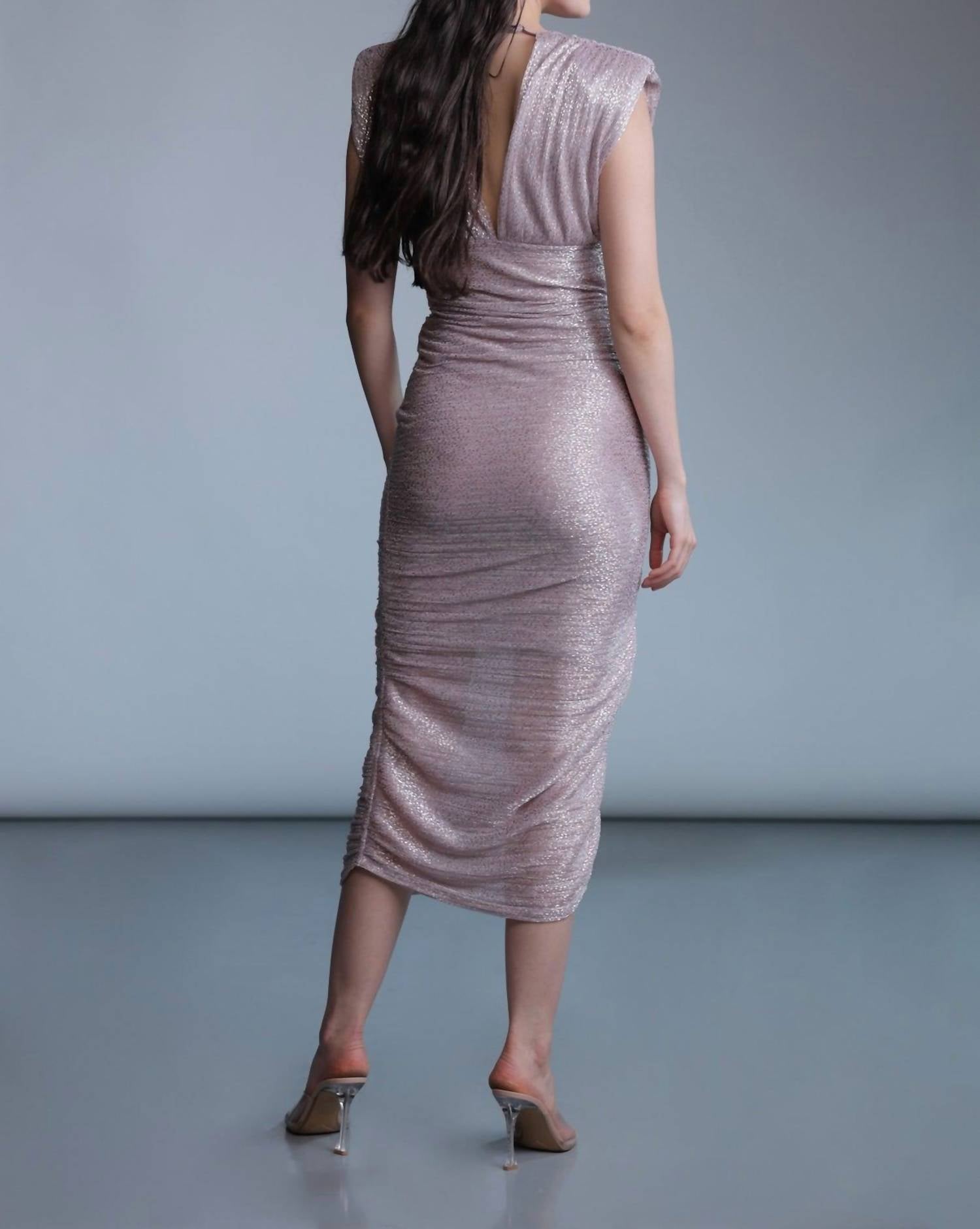 Просто добавьте шлепанцы или мюли, и вы готовы к выходу. Шагните в изысканность с платьем Faye от SABINA MUSAYEV, шедевром из розового кварца, который легко сочетает элегантность с ноткой дерзкого очарования. Изготовленное из роскошной ткани с люрексом, это платье миди украшено пленительной фольгированной отделкой, которая мерцает при каждом шаге. Глубокий V-образный вырез подчеркивает ваше декольте, а выразительные подплечники с изысканными сборками добавляют намек на винтажную драму. Невидимая молния сбоку обеспечивает бесшовную посадку, позволяя платью красиво драпироваться по вашему силуэту. Идеально подходит для любого случая, когда вы хотите оставить неизгладимое впечатление, платье Faye — это ваша любимая вещь, чтобы привлечь внимание и излучать уверенность.
