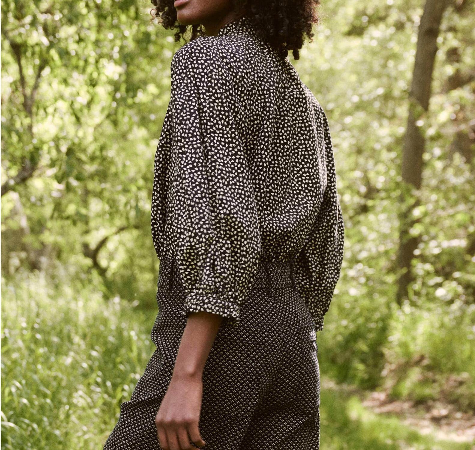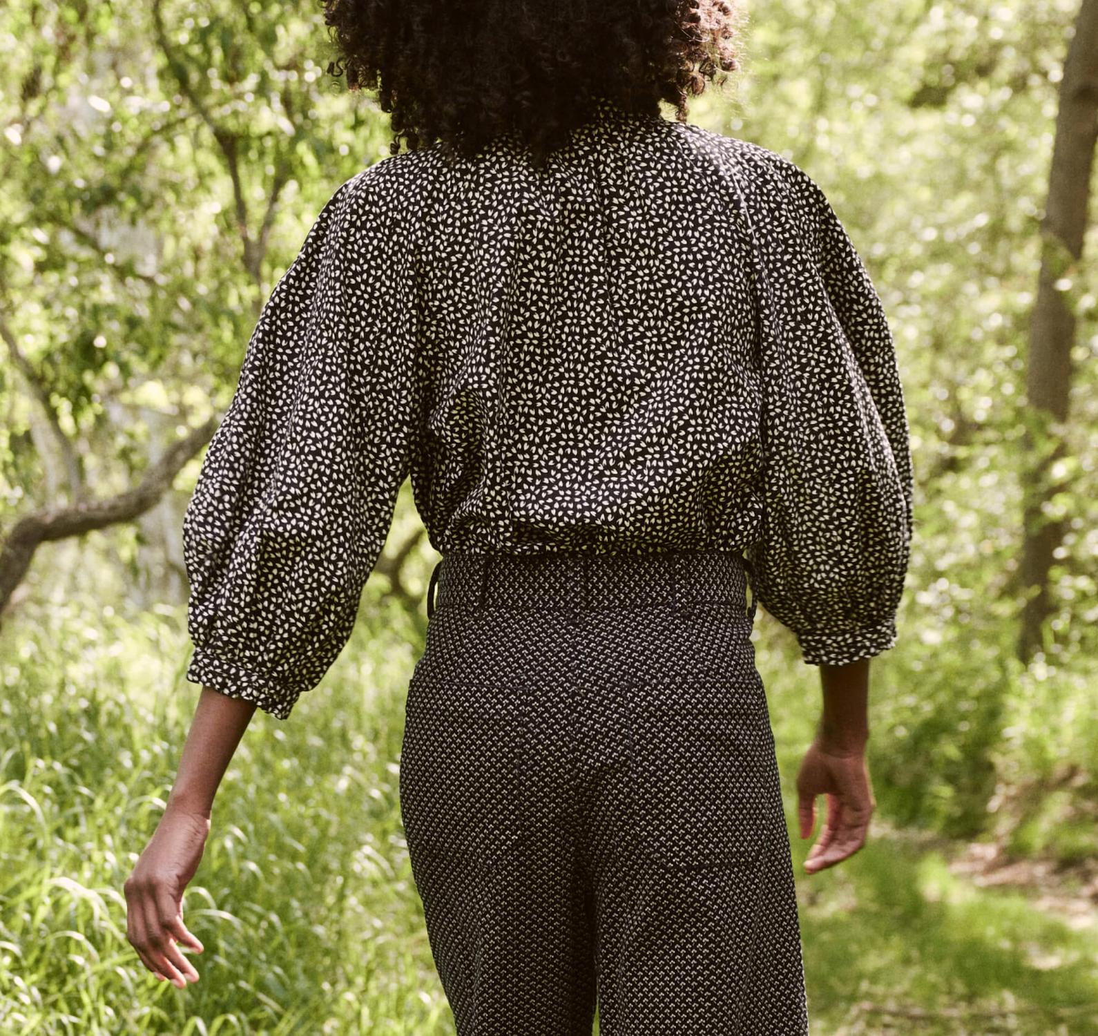 Топ Boutonniere. черпает вдохновение из викторианской эпохи с его высоким оборчатым вырезом, рукавами-фонариками и объемной сборкой. Этот новый силуэт легко и свободно облегает тело благодаря продуманным деталям, таким как планка с пуговицами спереди, двойная игольная строчка на рукавах реглан и изящные манжеты рукавов с оборчатыми краями, которые придают миловидность и очарование.