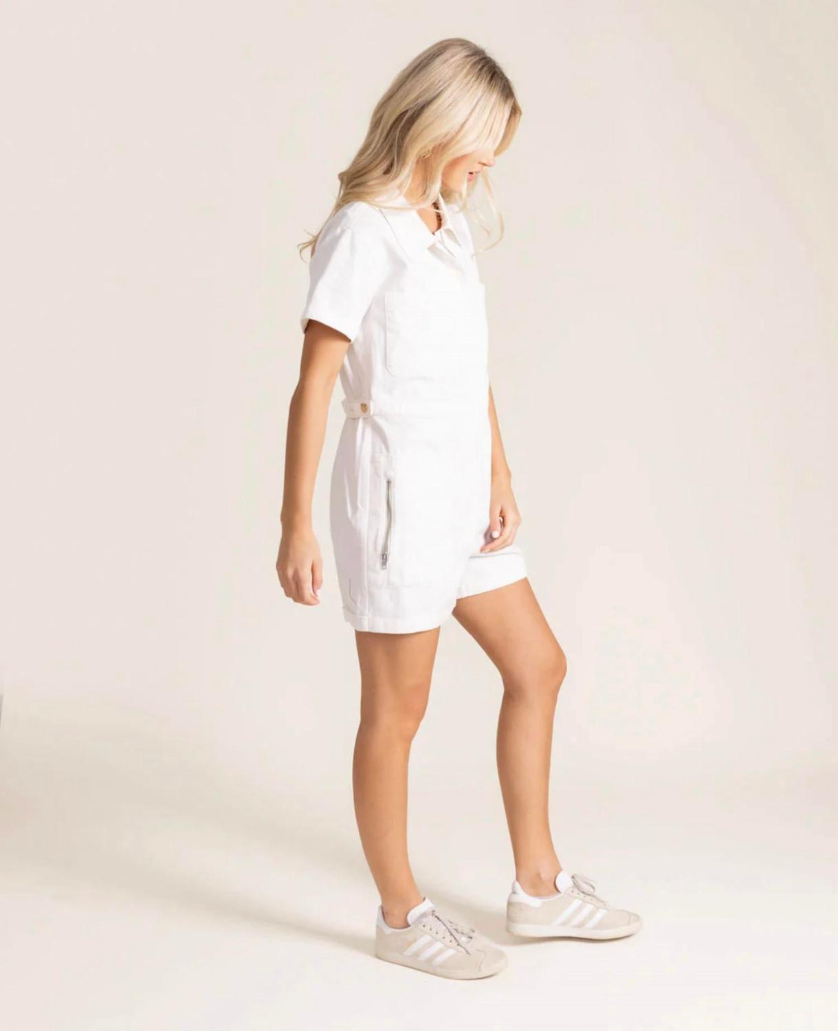 Непринужденный шик и комфорт. Сочетает стильную функциональность с непринужденным ощущением. Белый комбинезон, изготовленный из 100% плотного хлопкового денима. Обеспечивает структурированную, но удобную посадку. Имеет регулируемые хлястики на талии, которые позволяют подогнать по фигуре. Пуговицы на бедрах добавляют изысканности изделию. Карманы на молнии обеспечивают практичную функциональность без ущерба для стиля. Легкий цельный наряд, требующий минимальных усилий, чтобы выглядеть безупречно. Можно стирать в стиральной машине и соответствует размеру.
