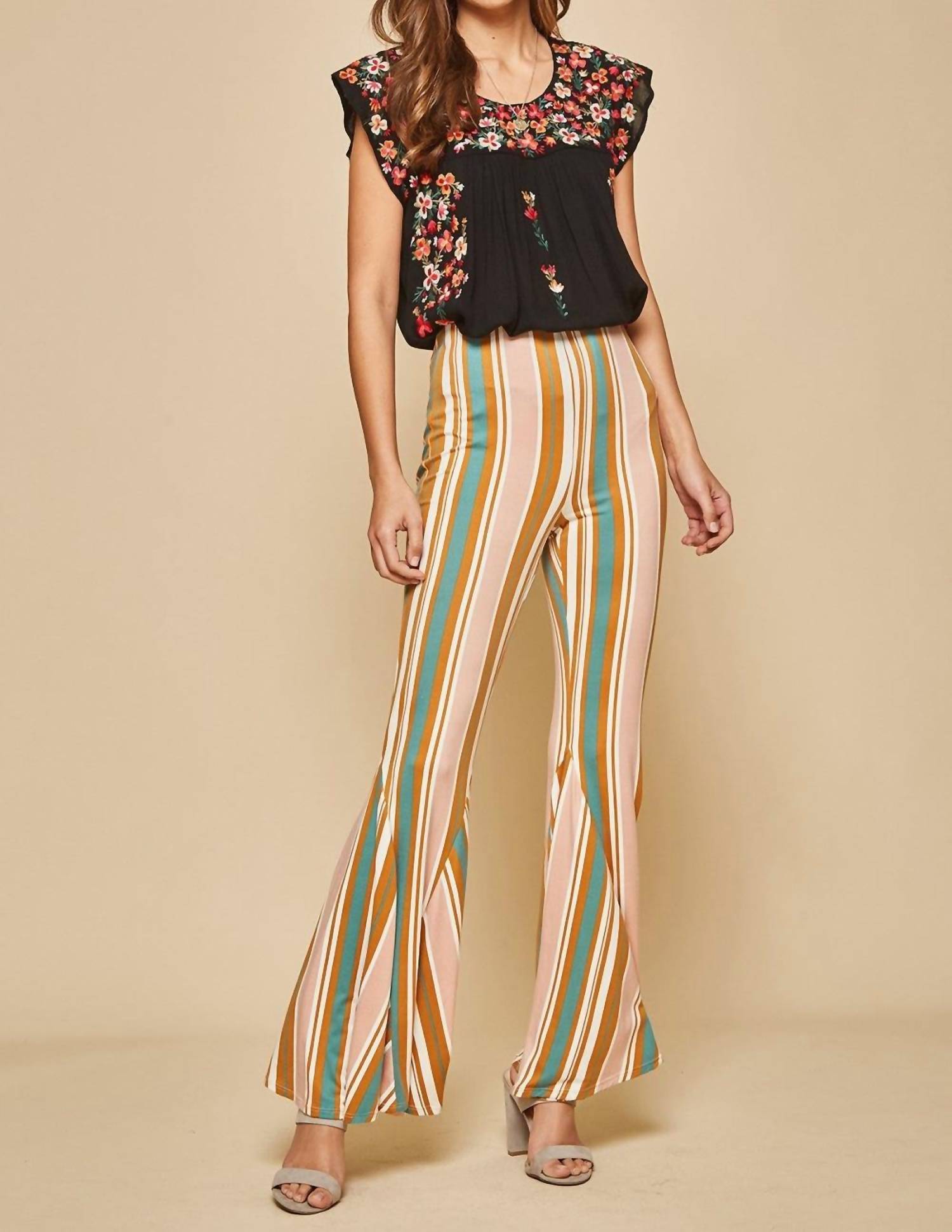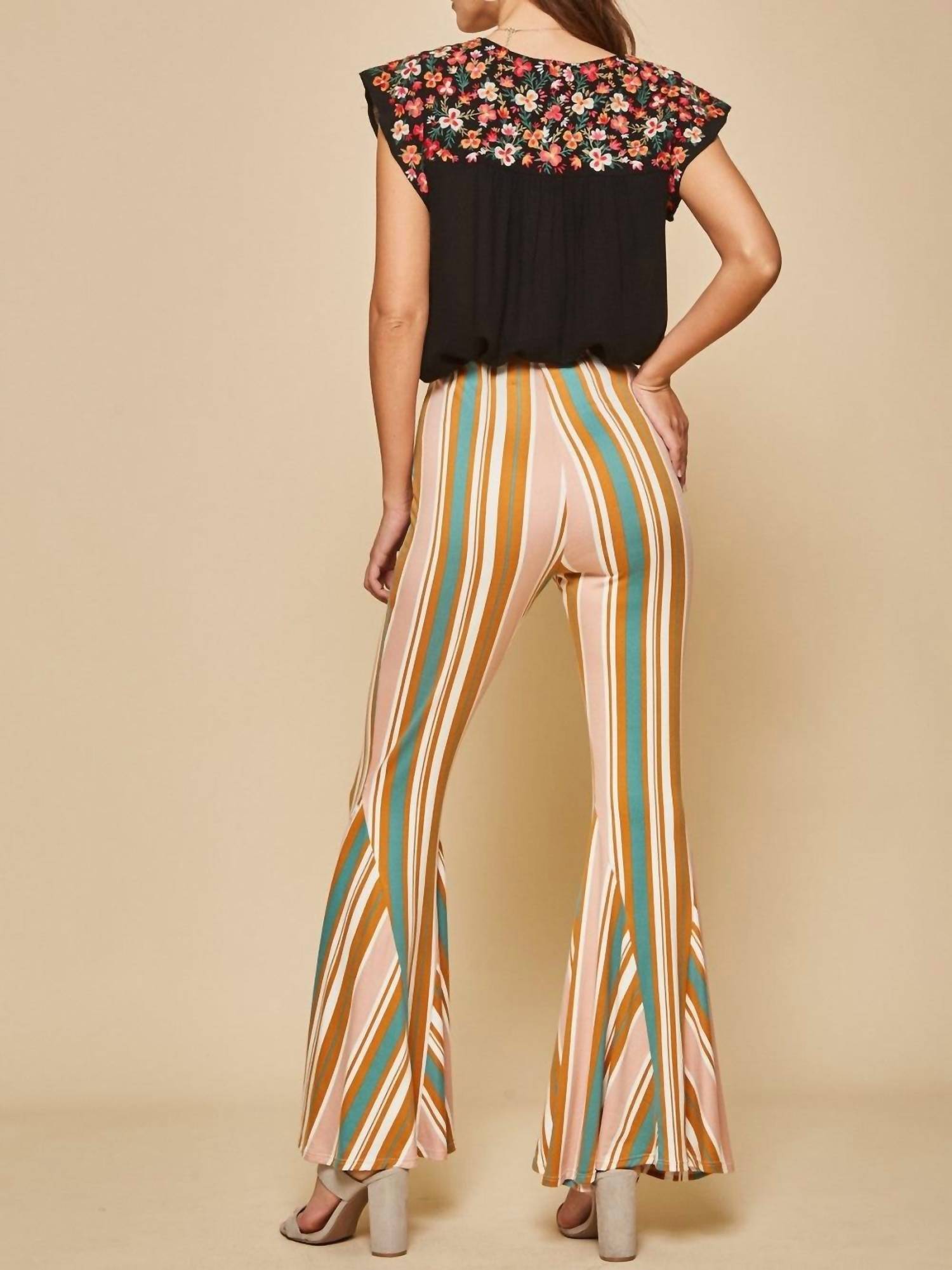 Эти полосатые трикотажные брюки имеют расклешенный силуэт, эластичную талию, разноцветные полосы и эластичную трикотажную ткань. Small - талия 26". Medium - талия 28". Large - талия 30". 1X - талия 36". 2X - талия 38". 3X - талия 40". Длина внутреннего шва примерно 32". 92% полиэстер, 8% спандекс. Сделано в Мексике. Ручная стирка или химчистка.