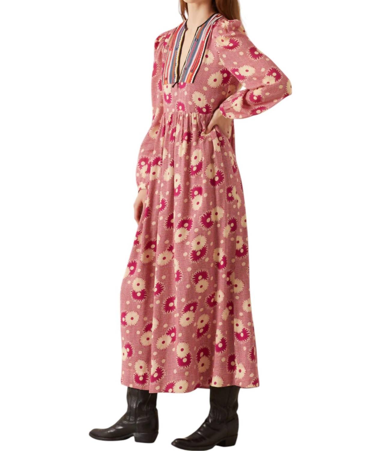 Откройте для себя непреходящую привлекательность в пленительном принте Berry Daisy. Платье с длинными рукавами представляет собой роскошную смесь 60% шерсти и 40% хлопка. Представляет романтический силуэт с цветочным узором и А-образным силуэтом платья. Изготовлено в Индии. Имеет характерный V-образный вырез, подчеркнутый полосатой отделкой ручной работы. Предлагает застежку-липучку для непринужденного стиля. Требуется только профессиональная химчистка.