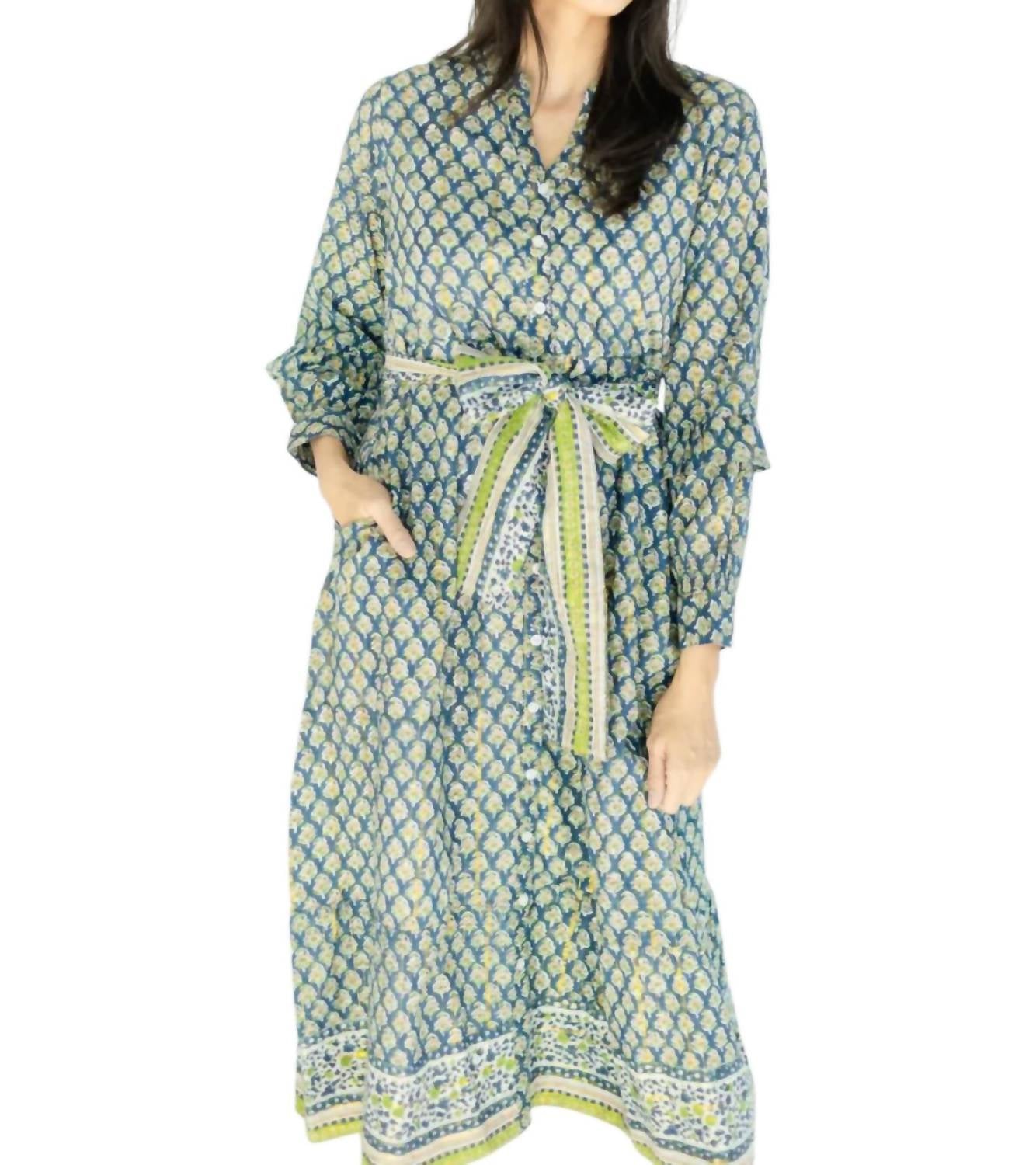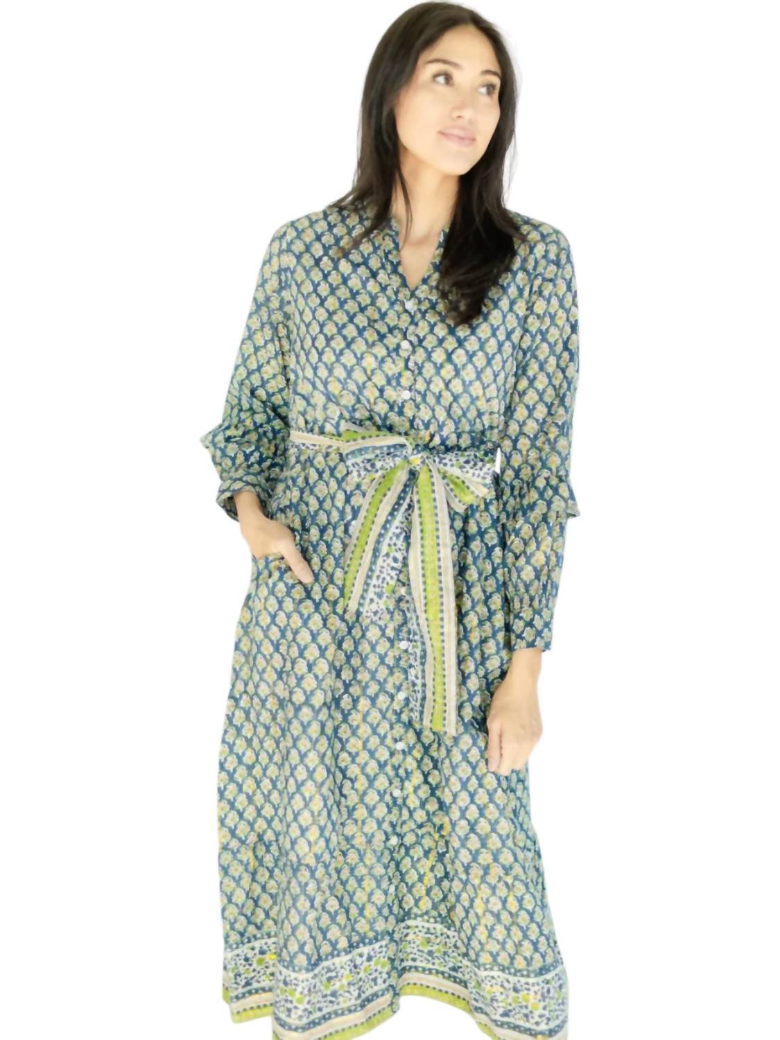 Потрясающее сочетание традиционного мастерства и современного стиля. Платье-футляр с длинными рукавами изготовлено из 100% хлопкового люрекса. Изготовлено вручную мастерами в Индии. Имеет V-образный вырез с воротником-стойкой и пуговицами от воротника до подола. Дополнено соответствующим поясом и контрастной отделкой. Разработано с подкладкой внутри для дополнительного комфорта. Включает удобную застежку на пуговицы и удобные карманы. Только ручная стирка.