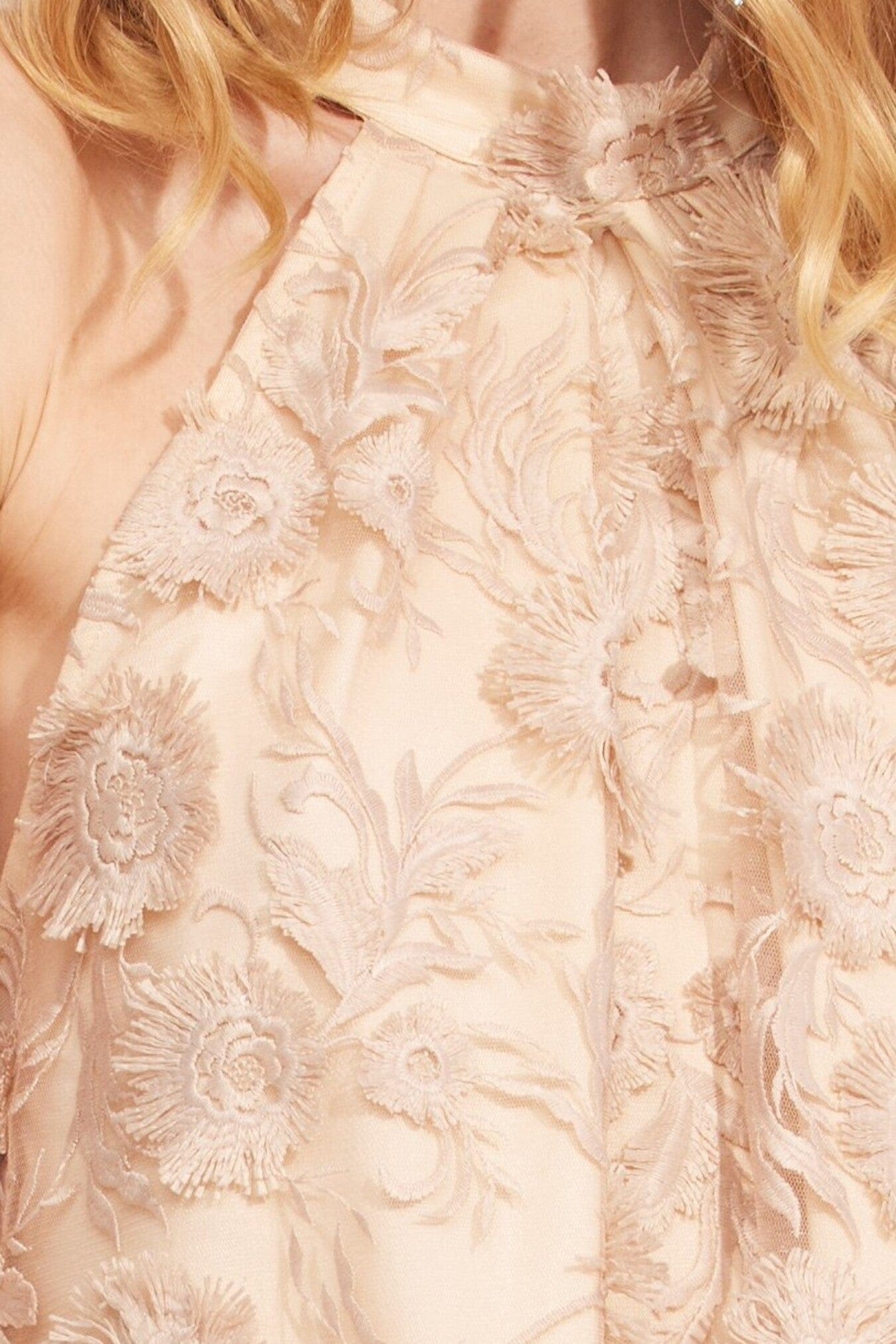 Веселое и соблазнительное мини-платье свободного кроя из нашей великолепной ткани Bloomsfield, которая представляет собой 3D вышитое цветочное кружево в натуральном тоне. Регулируемая застежка-бабочка сзади.