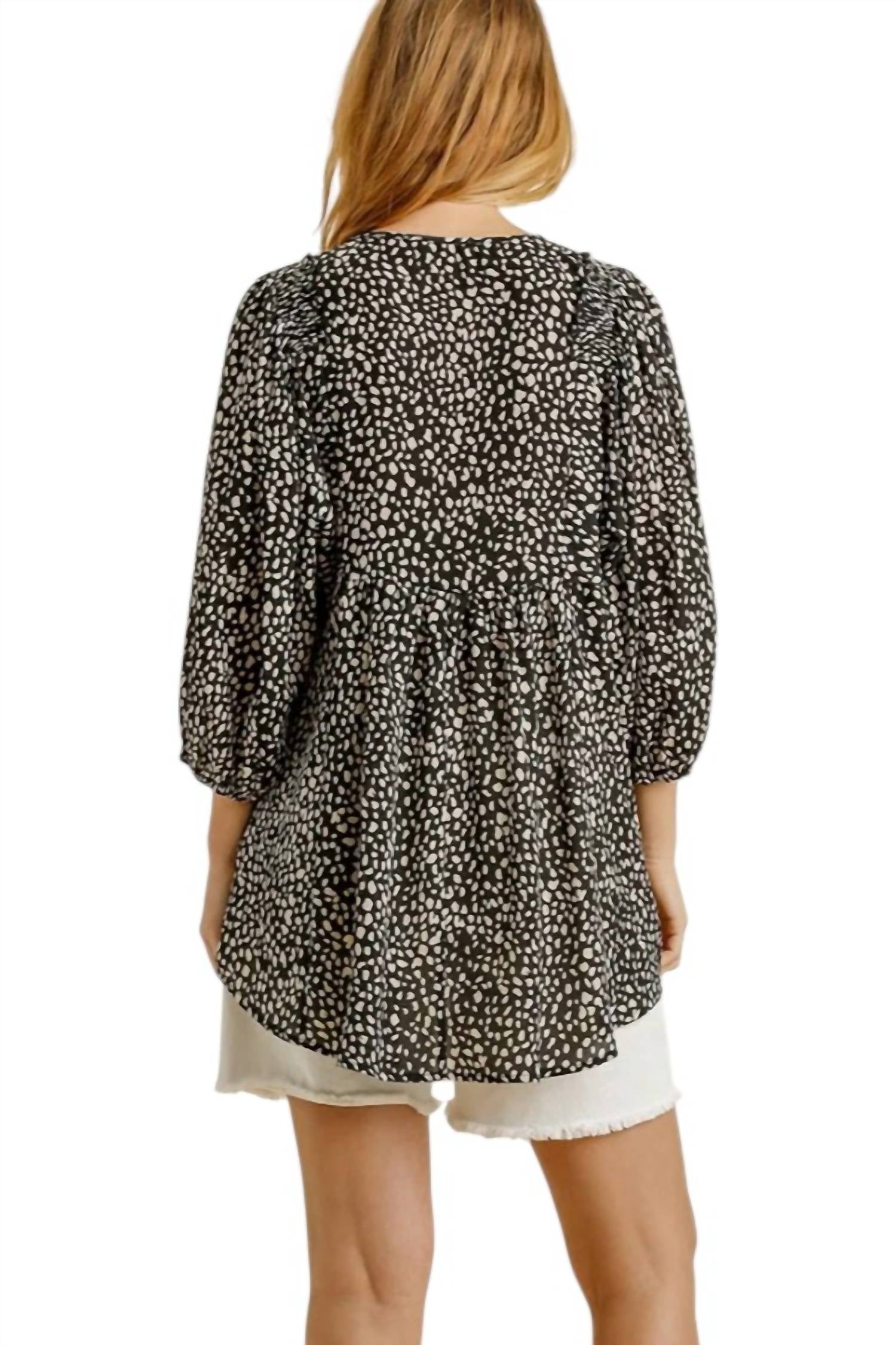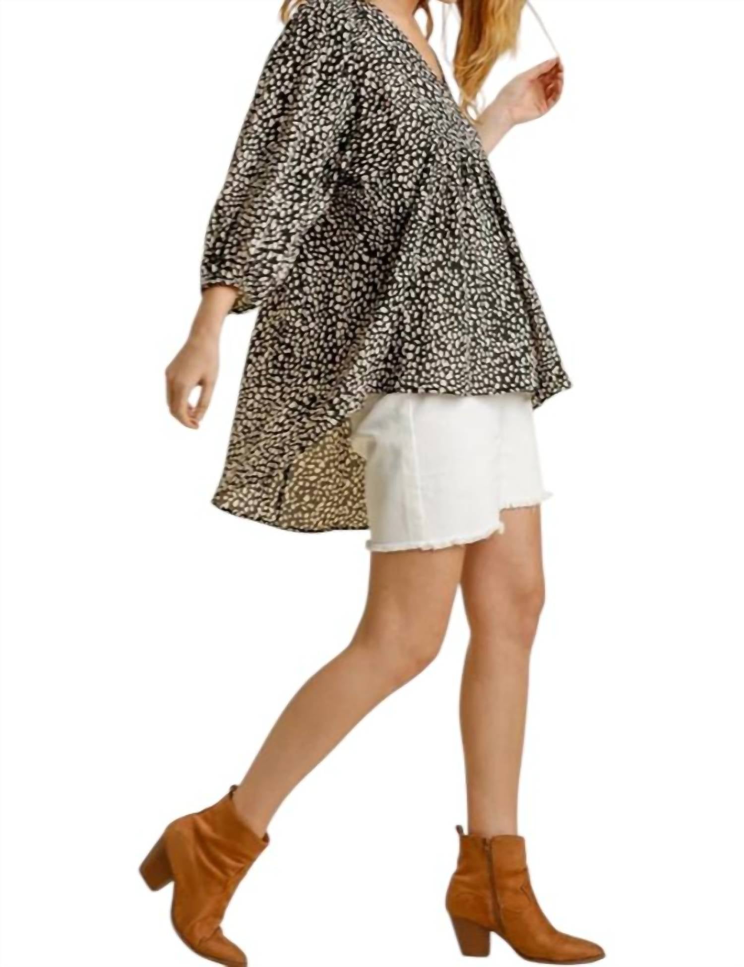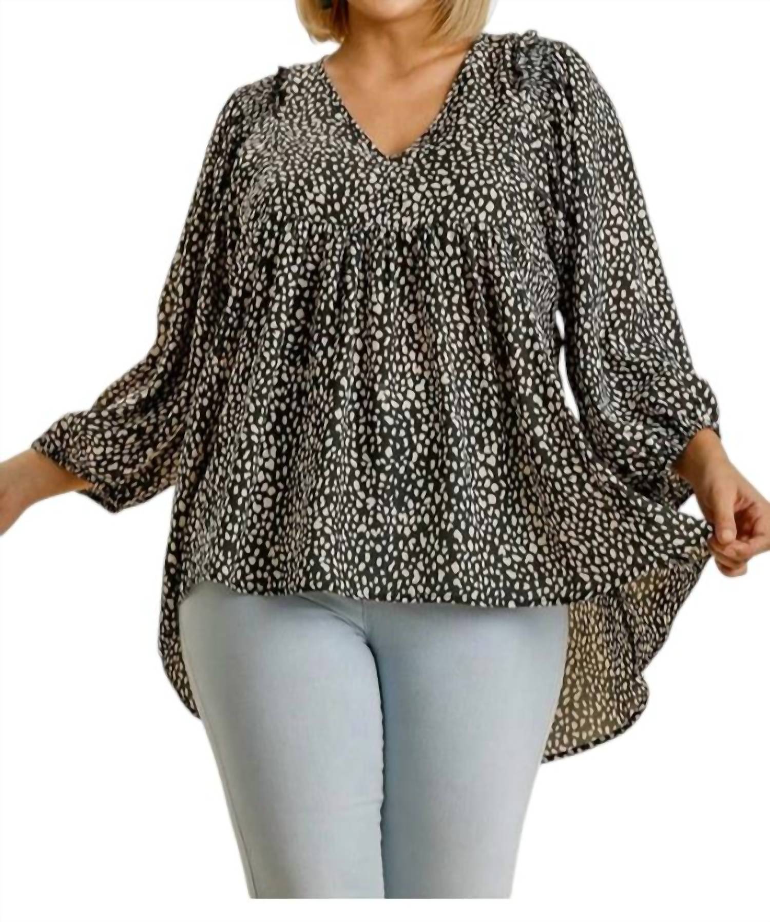 Ощутите атмосферу бохо с топом Cheetah Babydoll от Umgee, шикарным дополнением к любому гардеробу с модным пятнистым принтом. Эта блузка с рукавами три четверти на резинке, привлекательным V-образным вырезом и присборенными эластичными деталями на плечах создана для комфорта и стиля. Высокий низкий овальный подол добавляет игривости, что делает ее легким выбором для перехода от работы к ужину. Состав - 100% полиэстер. Застежка - надевается. Уход - ручная стирка в холодной воде.