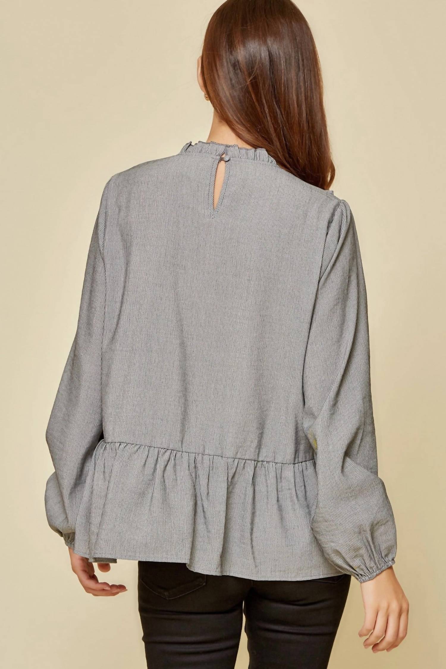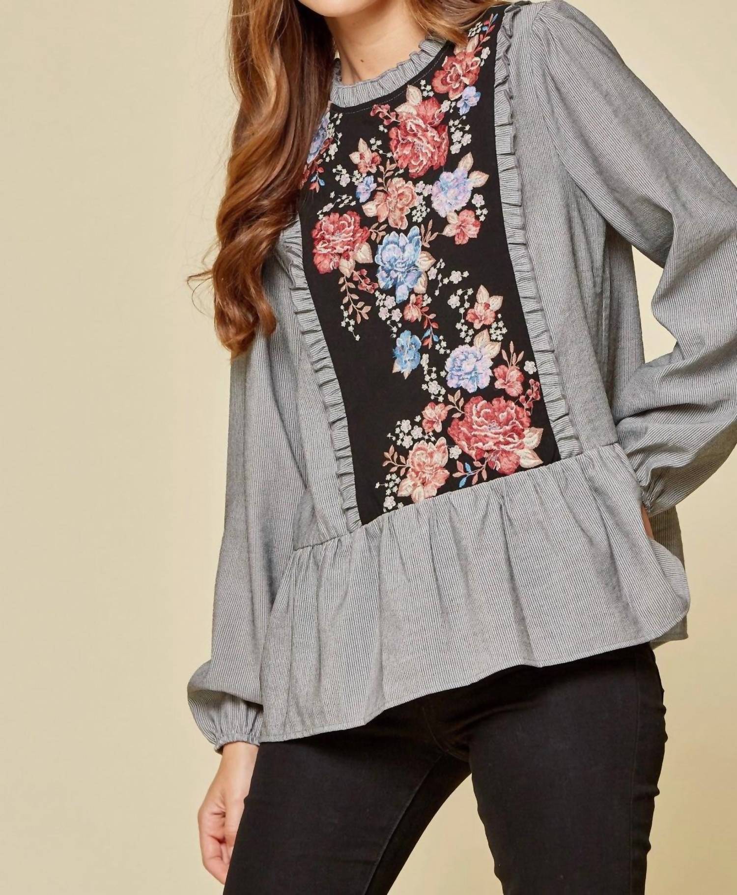 Блузка с оборкой на горловине, длинными рукавами-фонариками с резинкой на запястье, красочной цветочной вышивкой, тканью в тонкую полоску угольно-черного цвета, застежкой-капелькой на спине и оборкой на подоле. Маленький размер - обхват груди 40 дюймов, длина 27 дюймов, Средний размер - обхват груди 42 дюйма, длина 27 дюймов, Большой размер - обхват груди 44 дюйма, длина 27 дюймов, 53% полиэстер, 35% вискоза, 12% нейлон. Ручная стирка в холодной воде.