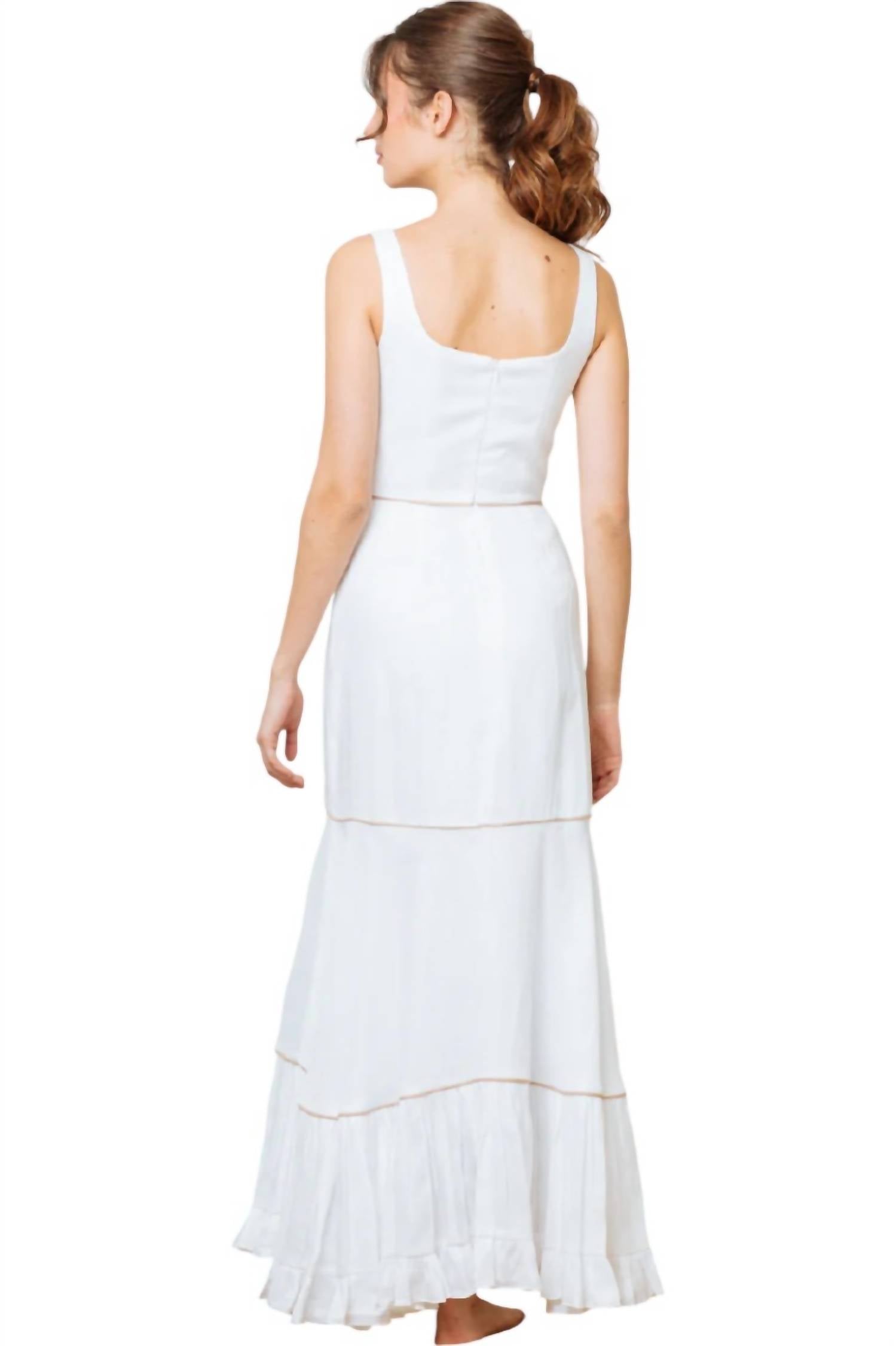 Непринужденная элегантность в потрясающем белом макси-платье. Излучает изысканность благодаря классическому квадратному вырезу и изящным бретелям. Приталенный и расклешенный силуэт прекрасно дополняет вашу фигуру. Полностью подшитая юбка с оборками добавляет нотку причудливого очарования. Разработано для комфорта и стиля. Имеет незаметную застежку-молнию сзади. Изготовлено из роскошного 100% льна с мягкой подкладкой из вискозы.
