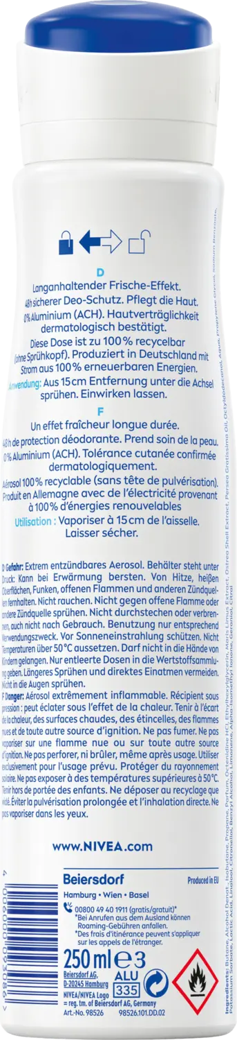 Натуральный дезодорант-спрей NIVEA Fresh с формулой INFINIFRESH обеспечивает длительную свежесть и ощущение чистоты кожи. Он активно борется с бактериями, вызывающими запах, и обеспечивает надежную защиту от пота и запаха в течение 48 часов. Формула, протестированная дерматологами, бережно воздействует на кожу и обеспечивает комфортное ношение. Идеально подходящий для повседневного использования, этот дезодорант-спрей сохраняет кожу свежей и ухоженной. Идеально подходит для тех, кто хочет чувствовать себя уверенно и комфортно в течение дня.