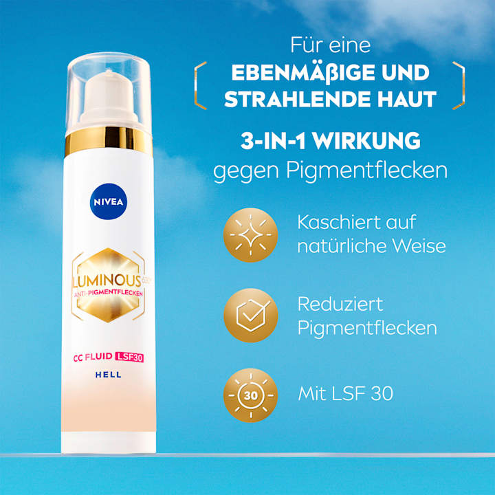 Антипигментные ПЯТНА LUMINOUS630 CC FLUID с LSF30 в цвете средство обеспечивает сияющий цвет лица. Эффект 3-в-1 маскирует и корректирует тон кожи, заметно уменьшая пигментные пятна всего за две недели и выравнивая цвет лица на 40 процентов за восемь недель, а также защищает от ультрафиолетовых лучей и предотвращает появление новых пигментных пятен.
