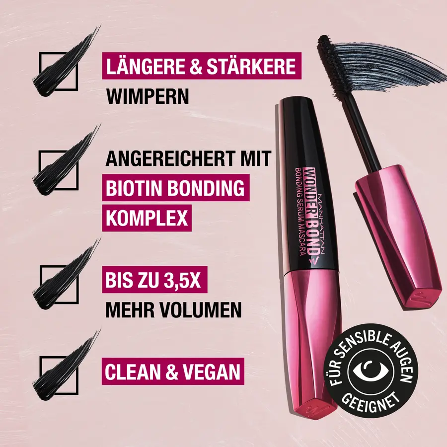 ЭТО #BONDING TIME в МАНХЭТТЕНЕ. Тушь Manhattan Wonder'Bond Bonding Serum придает ресницам более длинный, сильный и здоровый вид, а также увеличивает объем в 3,5 раза. Она содержит комплекс связывания биотина, который мгновенно заметно и заметно оживляет ресницы: биотин, аргинин, провитамин B5 и экстракт цветков клевера кондиционируют ресницы и укрепляют их кератиновую структуру. Сверхточная кисть обеспечивает идеальное расчесывание ресниц и равномерное нанесение цвета без образования комков – для длинных и идеально разветвленных ресниц. Чистая и веганская формула также подходит для чувствительных глаз. Манхэттен признан свободным от жестокого обращения в рамках Международной программы прыгающих кроликов Cruelty Free.