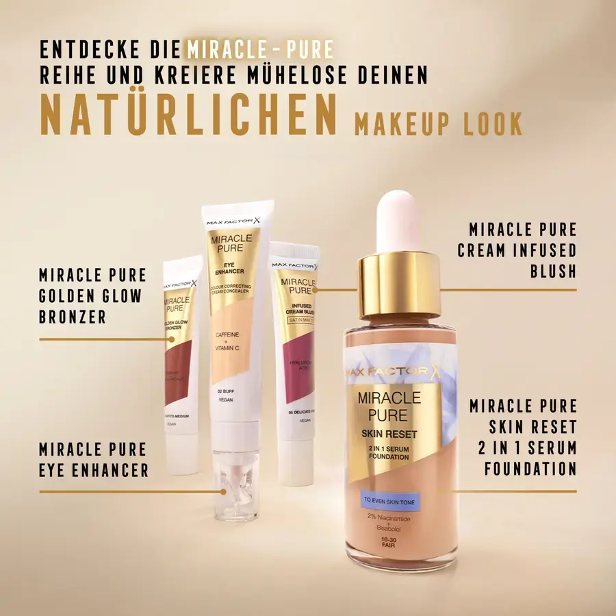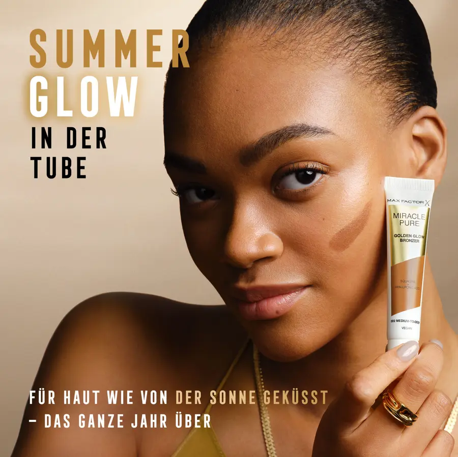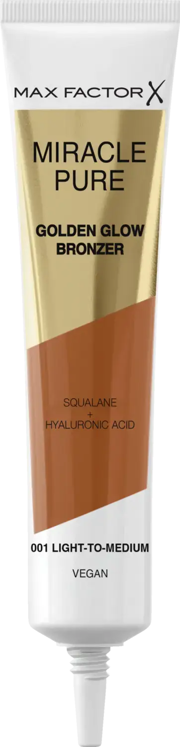 Подобно ярким лучам золотого летнего солнца, бронзер Max Factor Miracle Pure Golden Glow Bronzer придает коже нежное мерцающее теплое свечение. Благодаря своей нежной кремовой текстуре, он прекрасно растушевывается и приобретает желаемую интенсивность цвета. Таким образом, он придает коже лица, шеи и тела легкий естественный загар, а также идеально подходит для придания контура чертам лица. Веганский состав, обогащенный питательным скваланом и увлажняющей гиалуроновой кислотой, обеспечивает коже ощущение комфорта в течение всего дня. Бронзер Golden Glow, доступный в двух оттенках, можно наносить отдельно, под макияж или поверх него - для кожи, поцелованной солнцем, круглый год.