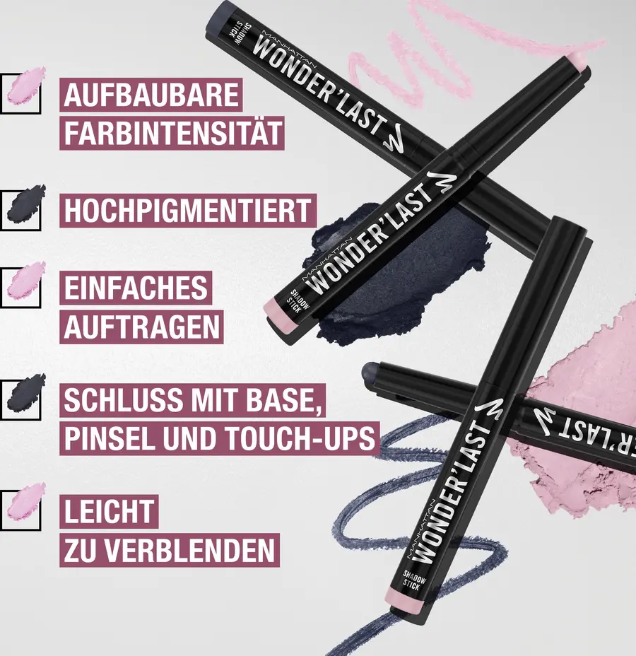 Ваши тени для век на выбор: Вам не понадобится грунтовка и кисть для нанесения Manhattan Wonder 'Last Shadow Stick. Ультра-кремовый карандаш для теней наносится очень легко и надолго придает векам матовый цвет. Просто проведите карандашом по крышкам – благодаря настраиваемой формуле вы сами определите, насколько насыщенным вы хотите, чтобы образ был. Палочка Wonder 'Last Shadow Stick является веганской и не содержит отдушек, что обеспечивает комфортное ношение. В то же время он устойчив к растеканию, не оставляет пятен и прослужит весь день, не освежаясь. Получите стойкий яркий цвет с кремово-матовой отделкой в модных оттенках.