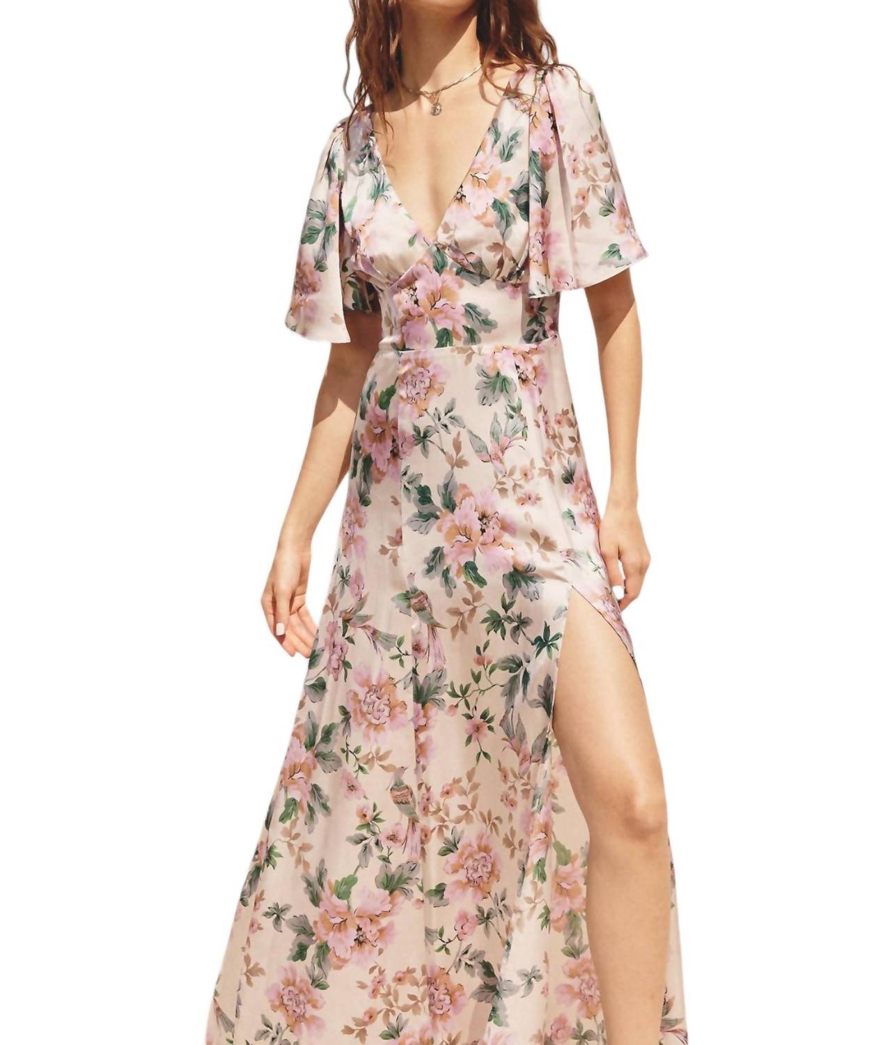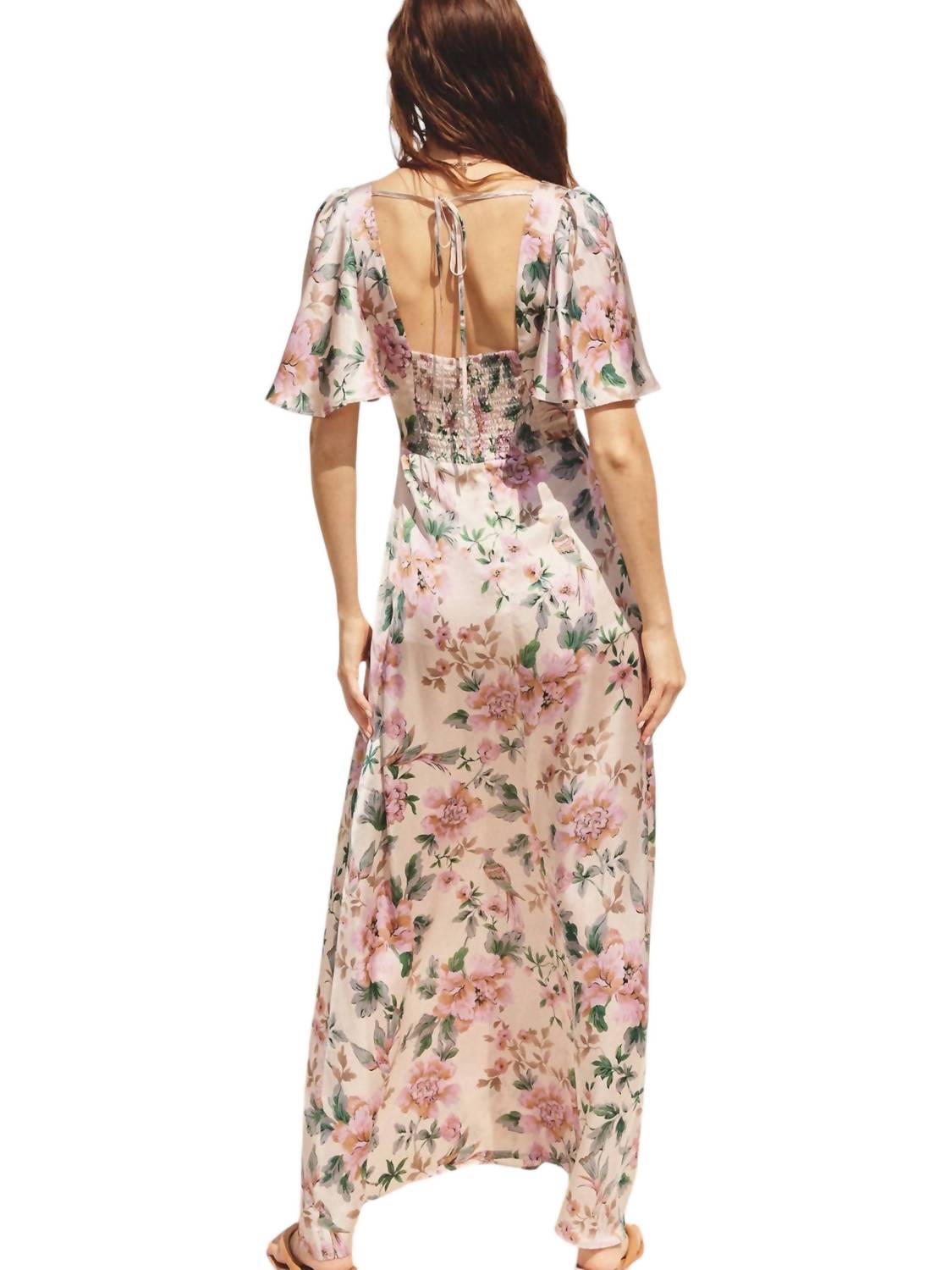 Непринужденная элегантность и очаровательное макси-платье с причудливым цветочным принтом. Вызывает красоту безмятежного луга в полном цвету. Разработано для комфорта и стиля. Короткие рукава-крылышки и глубокий V-образный вырез красиво обрамляют вашу фигуру. Деталь на груди добавляет нотку романтического очарования. Струящаяся юбка с разрезом спереди. Обеспечивает легкость движений и намек на кокетливое очарование. Завязка на плече сзади обеспечивает дополнительную безопасность. Присборенная задняя панель и потайная застежка-молния обеспечивают бесшовную посадку. Изготовлено из 100% полиэстера как для внешней оболочки, так и для подкладки. Обеспечивает легкость и воздухопроницаемость. Только сухая чистка для поддержания его первозданного состояния.