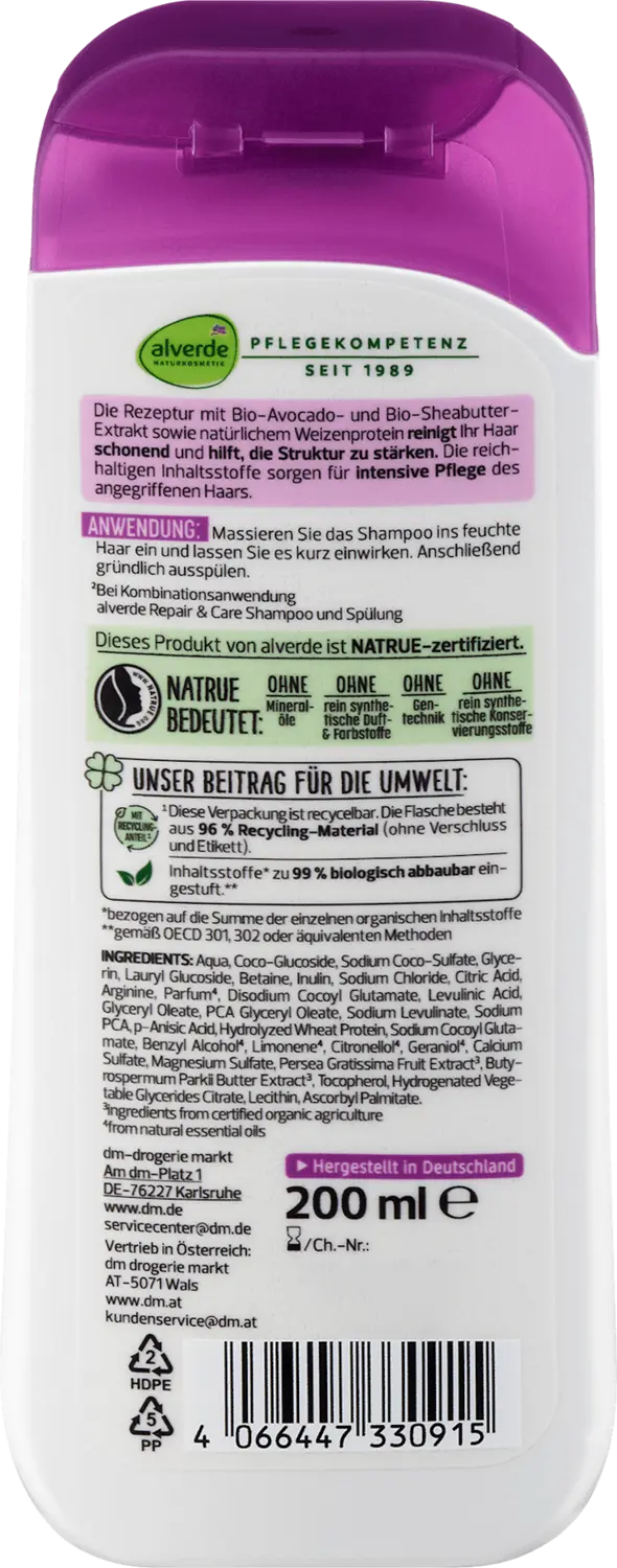 Восстанавливающий шампунь Bio-Avocado, Органическое масло ши от alverde НАТУРАЛЬНАЯ КОСМЕТИКА мягко очищает волосы и помогает укрепить структуру волос с помощью рецептуры с органическим авокадо, органическим экстрактом масла ши и натуральным пшеничным белком. Богатые ингредиенты обеспечивают интенсивный уход за поврежденными волосами. Рецепт без микропластиков и водорастворимых чистых синтетических полимеров."*Упаковка содержит разум. 70% -ная доля вторичной переработки".