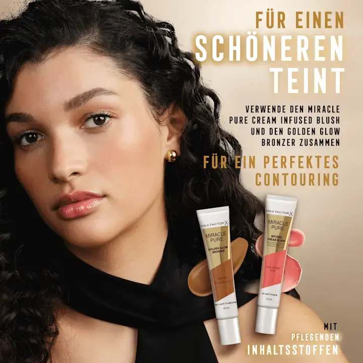 Бронзер Miracle Pure Golden Glow от MAX FACTOR цвета 001 от Light To Medium - идеальный продукт для сияющего цвета лица. Его можно использовать по-разному, будь то на лице, под или поверх макияжа, а также придаст шее и телу сияющий на солнце оттенок. Нежный мерцающий загар обеспечивает свежий вид круглый год. Веганская формула, обогащенная питательными ингредиентами, такими как сквалан, и увлажняющей гиалуроновой кислотой, обеспечивает не только цвет, но и уход за кожей. Благодаря кремовой текстуре бронзер прекрасно растушевывается, и его можно наращивать до желаемой интенсивности цвета, чтобы создать неповторимый образ.